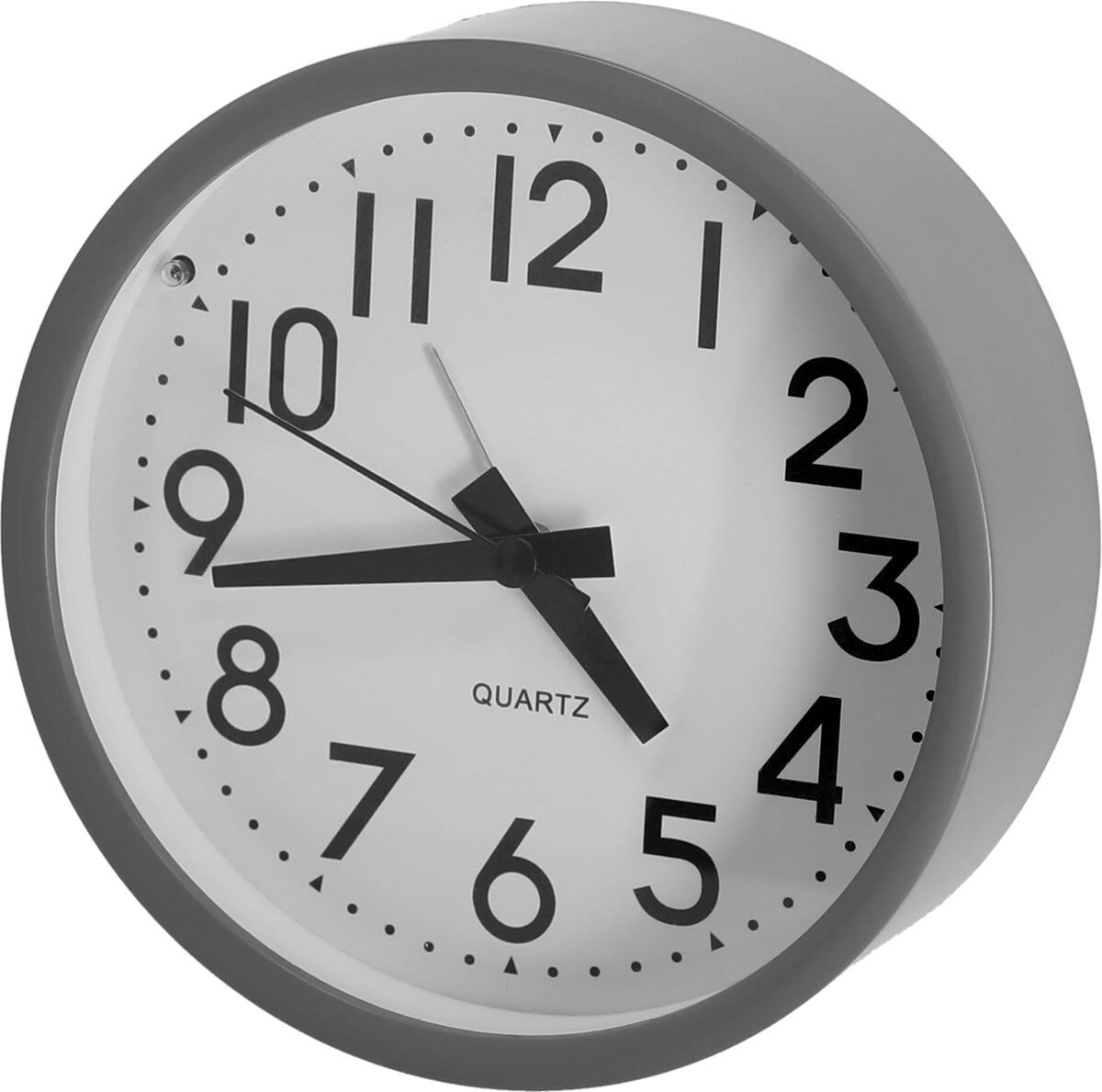 • Lettlest vekkerklokke med store tall og svarte visere på hvit urskive.