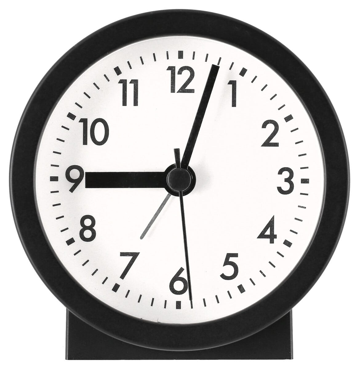 • Svart analog vekkerklokke med hvit urskive og lettleste svarte sifre.