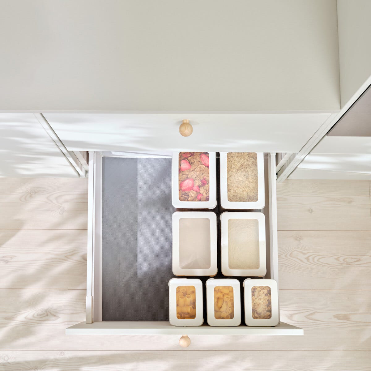 • Skuffeinnlegg med anti-slip – holder redskap og kjeler på plass.