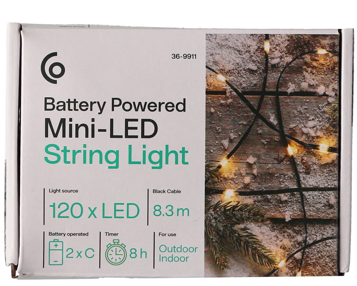 • Robust batteridrevet lyslenke med 120 integrerte LED-pærer og 8-timers timer.