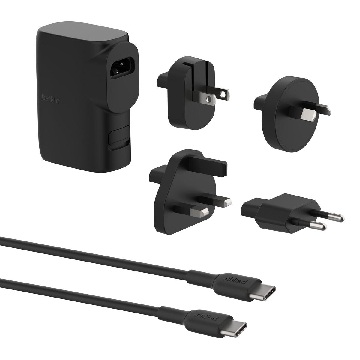 • USB-C-til-USB-C-ladekabel (1 meter lang) og 4 reiseadaptere følger med.