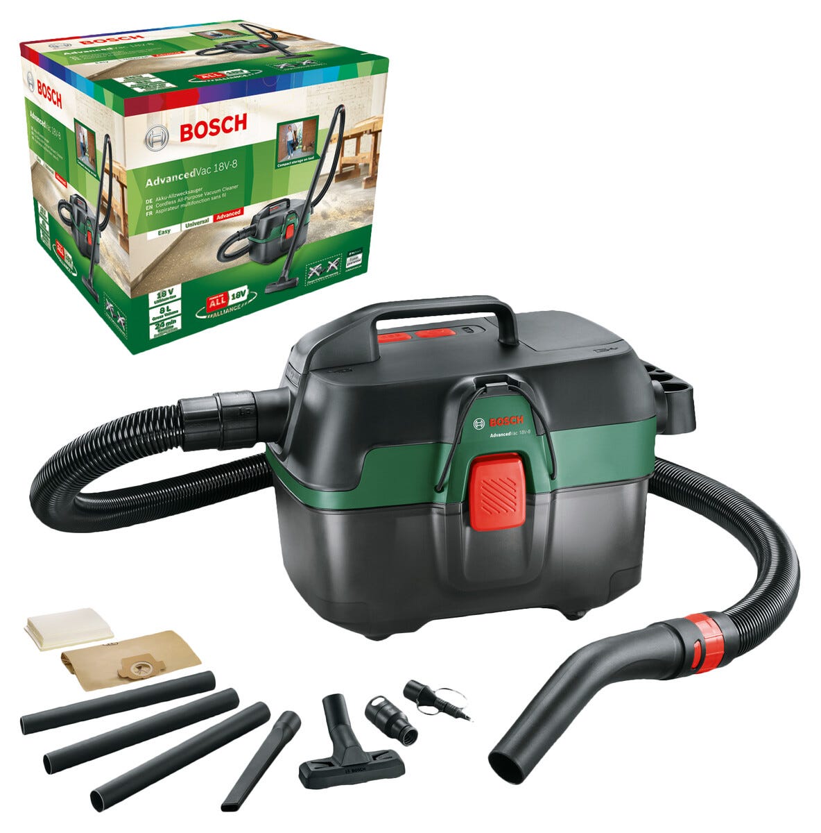 • Bosch AdvancedVac 18V-8 – grovstøvsuger for ute og inne.