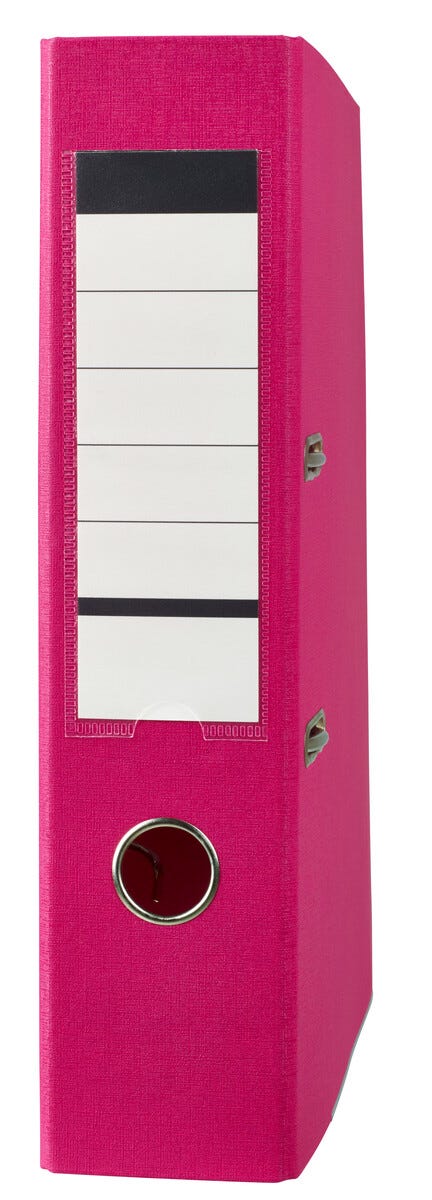 EU-standard. Kraftig kartong med farget folie. Nedre kantskinne av stål. Hebelmekanisme med 80 mm hullavstand. Gripehull i ryggen. Ryggbredde 80 mm.