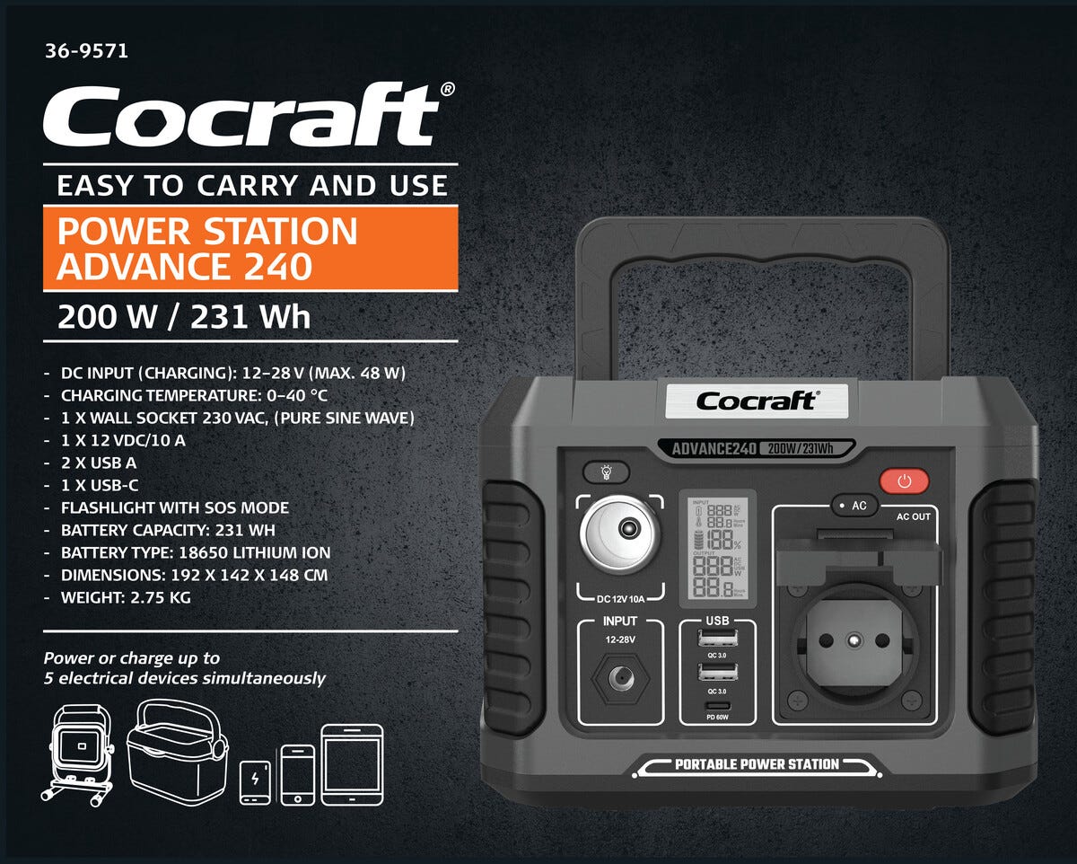• Cocraft Advance 240 – driv eller lad opp opptil 5 enheter (maks 200 W).