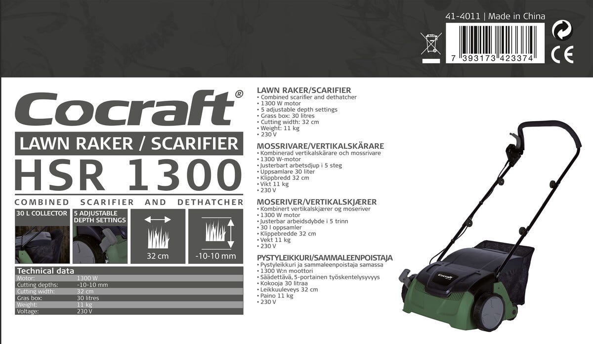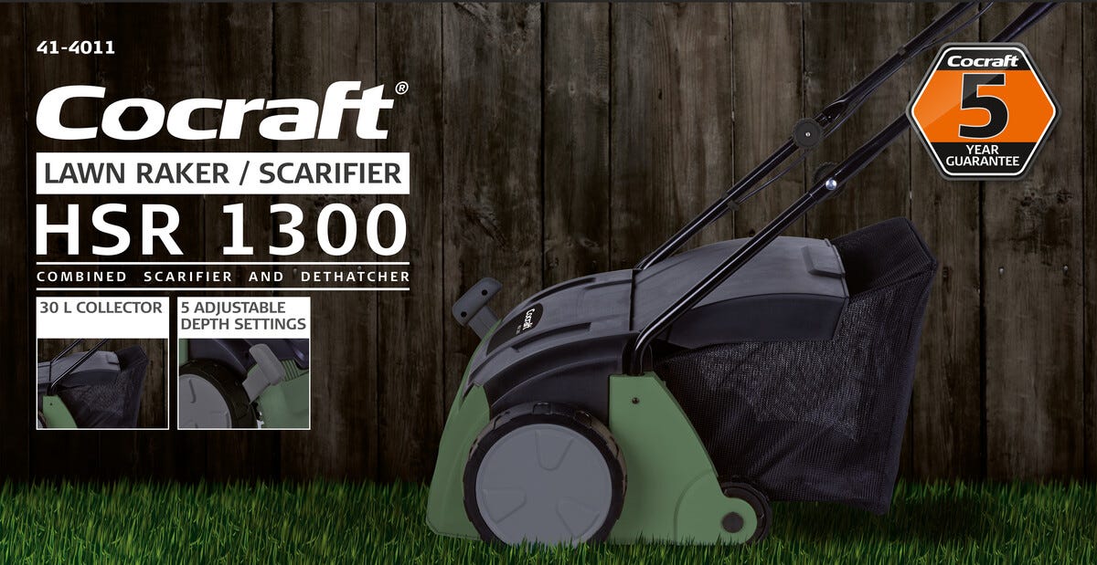 • Cocraft HSR 1300 – elektrisk mosefjerner og vertikalskjærer med 5 års garanti.