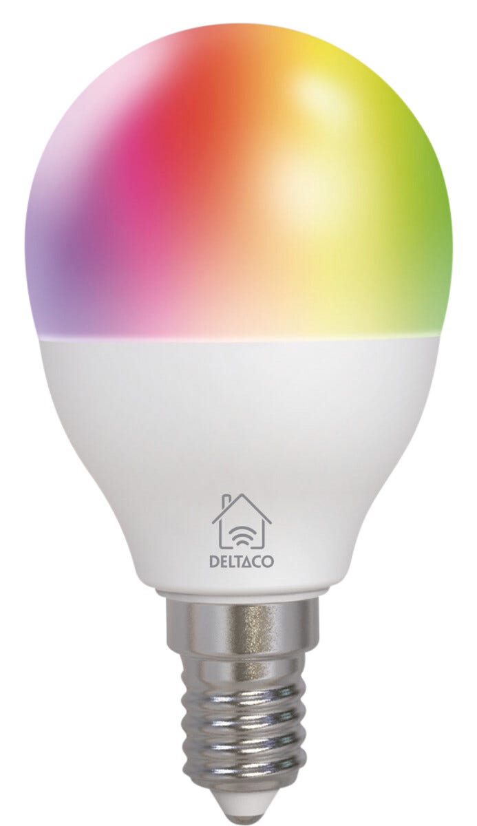 • Deltaco Smart LED-pære RGB E14 på 4,9 W – velg mellom 16 millioner farger.