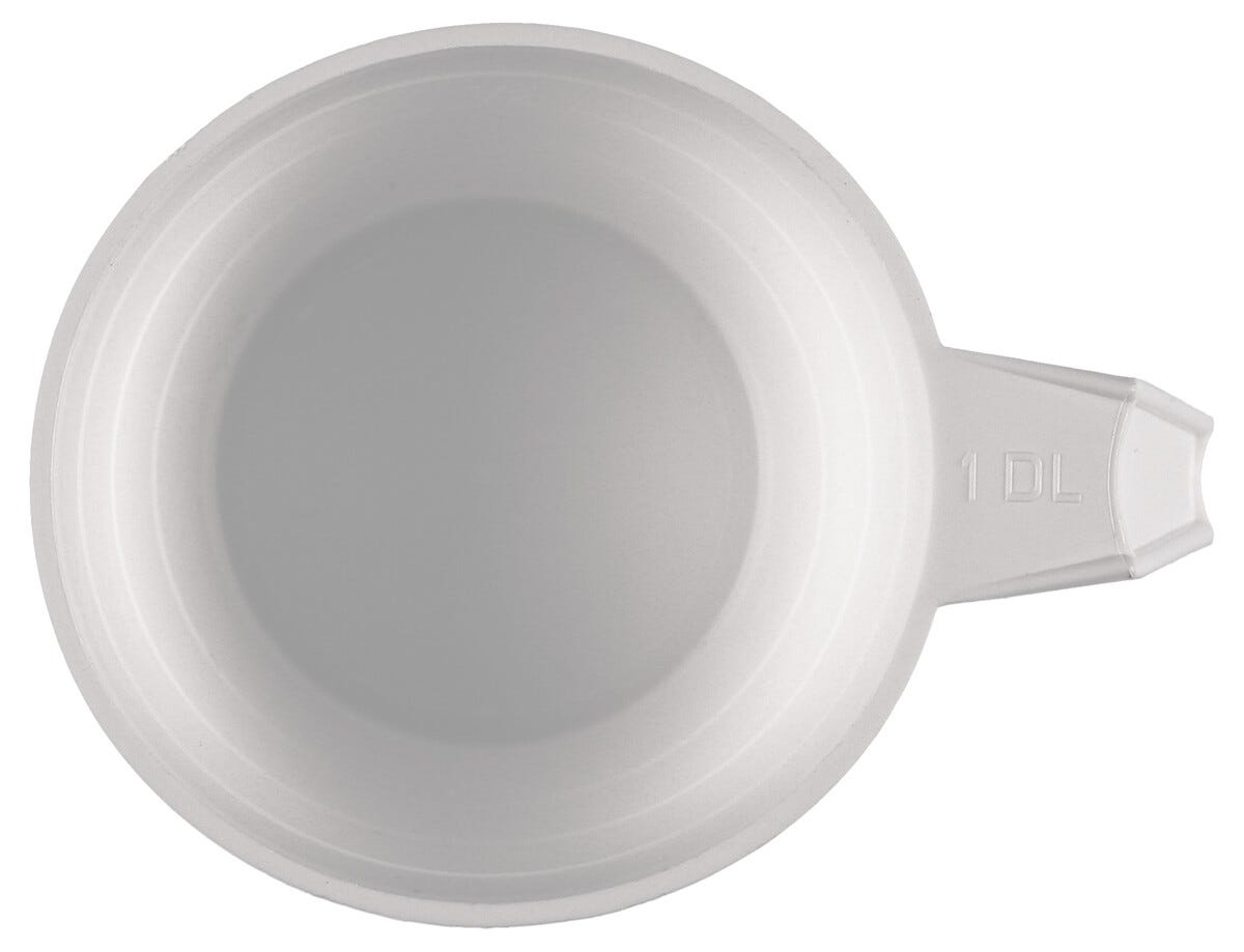 • Vita desilitermål i næringsmiddelgodkjent plast som tåler oppvaskmaskin.