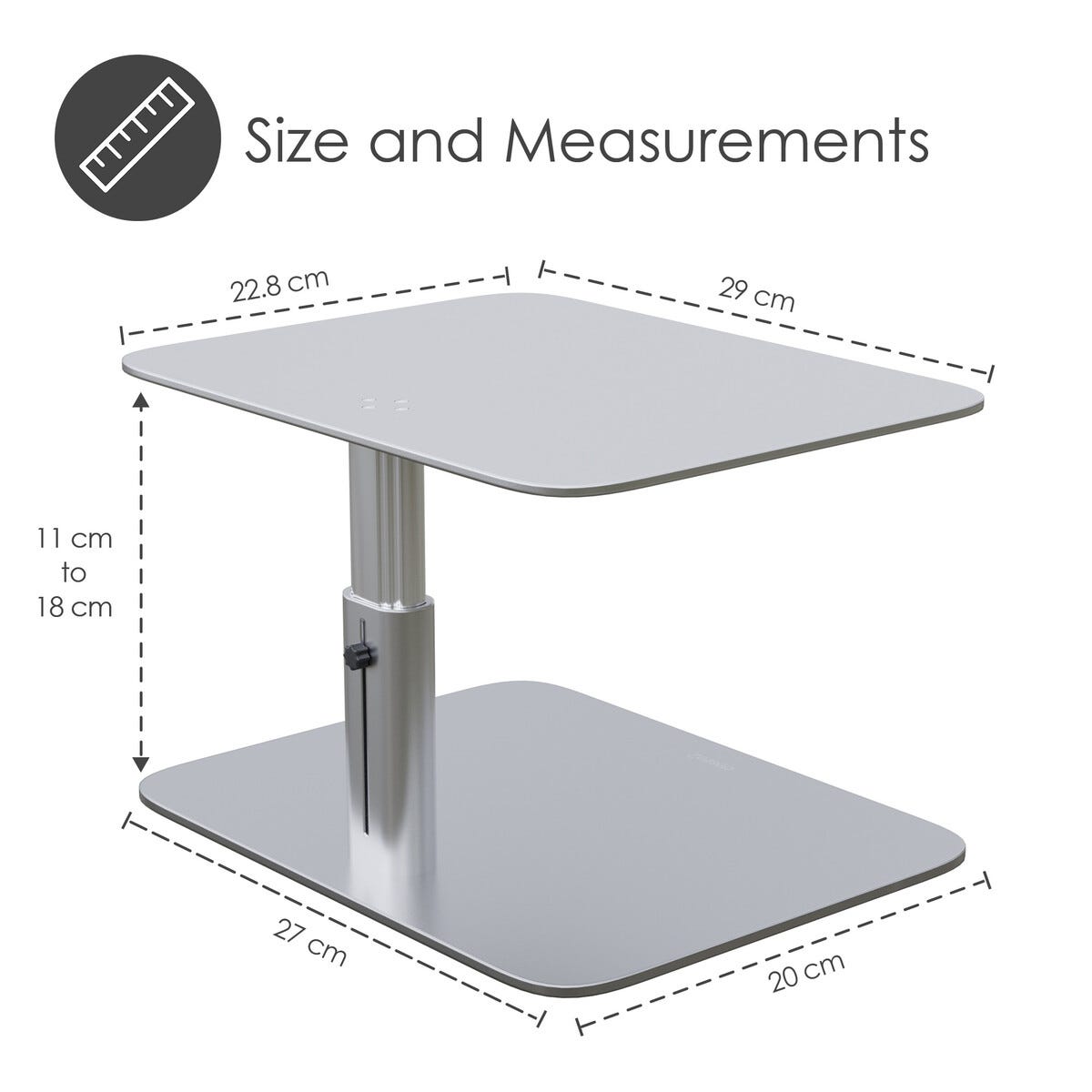 • Plattformens mål: 29 x 22,8 cm. Fotens mål: 27 x 20 cm. Vekt: 2,3 kg.