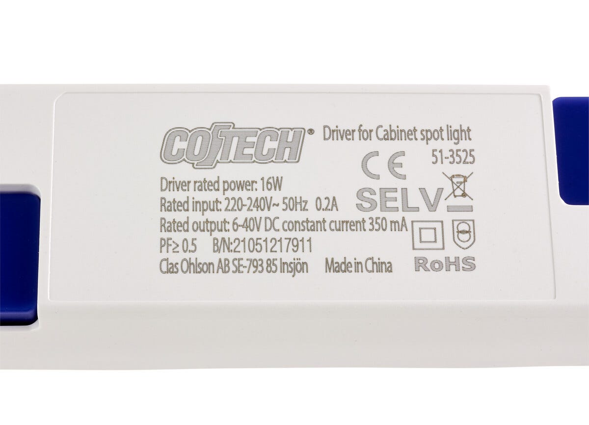 Driver/konstantstrømgenerator til LED downlights, 6-40 V DC/350 mA (maks 16 W) for 6 pærer. Til bl.a. Cotech, LED Downlight 3-pakning, art.nr. 36-7807.