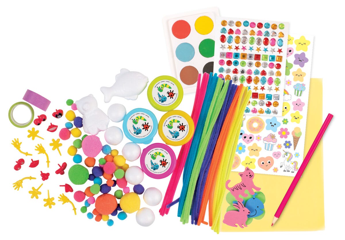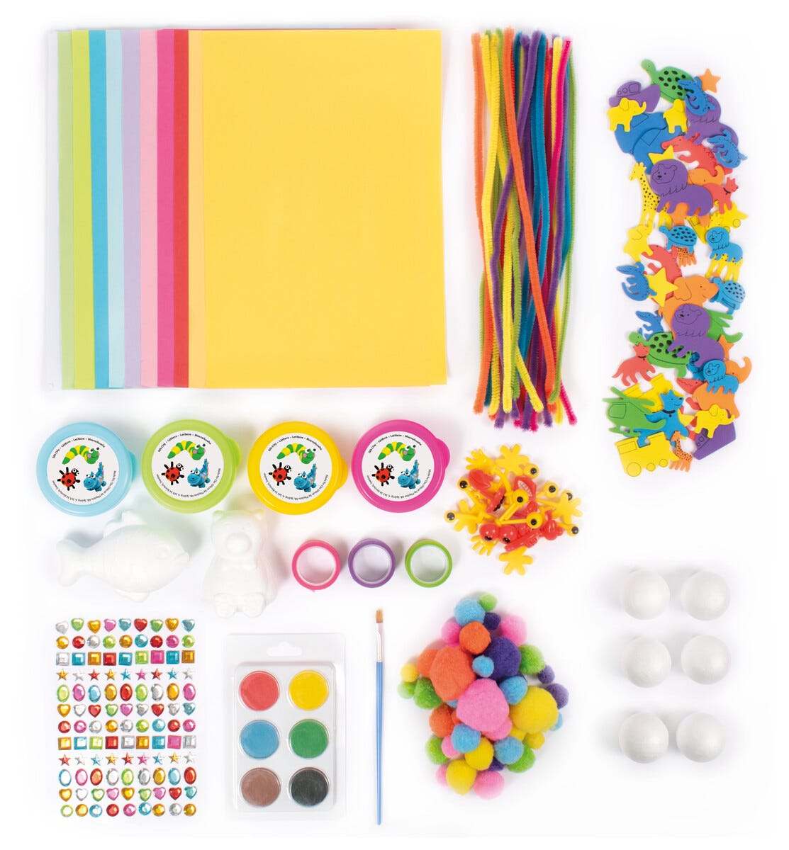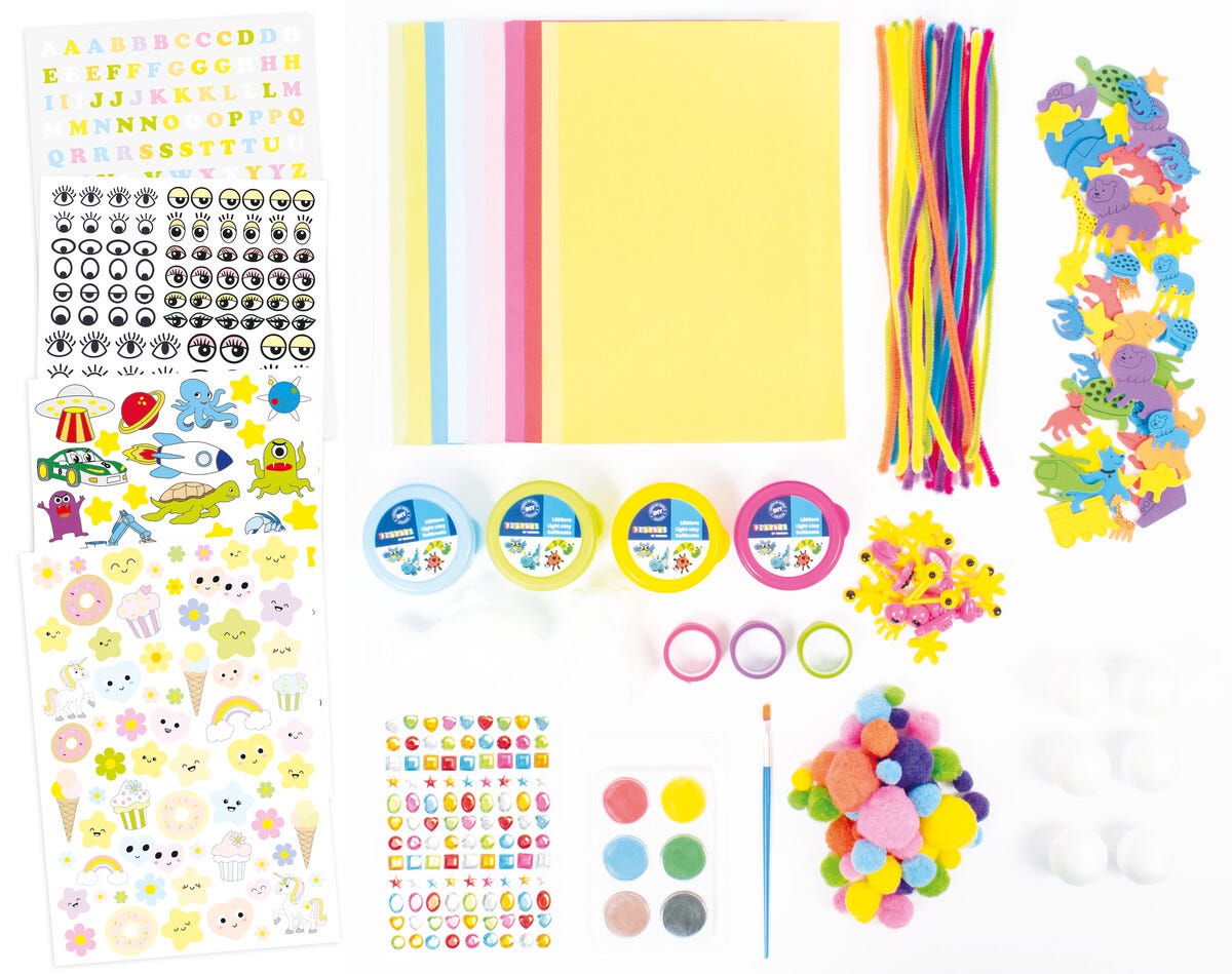 • 4 klistremerkeark, 3 ruller washi-teip, 20 fargede ark, 10 fargeblyanter, 50 EVA-dyr.