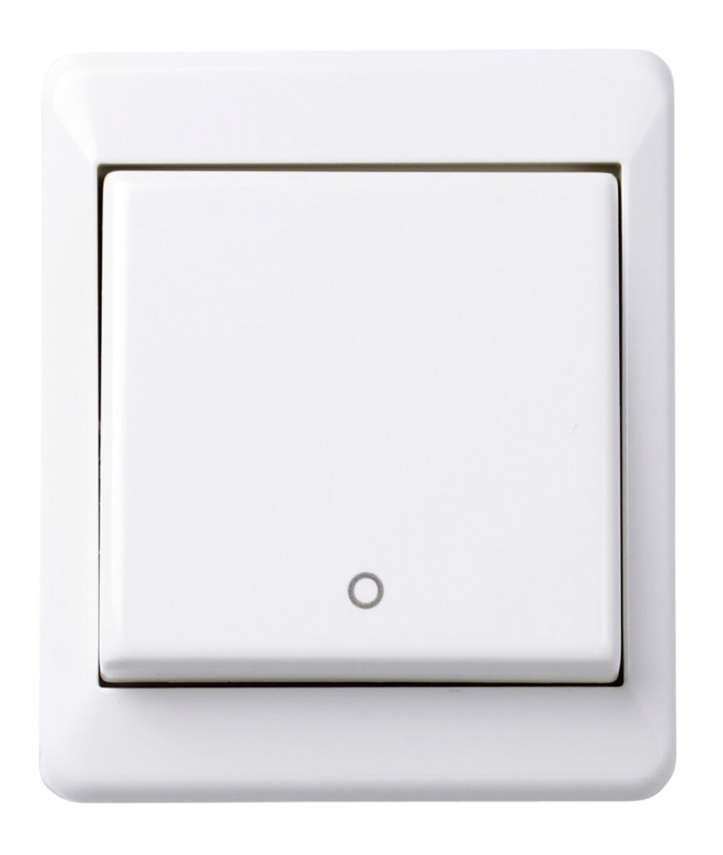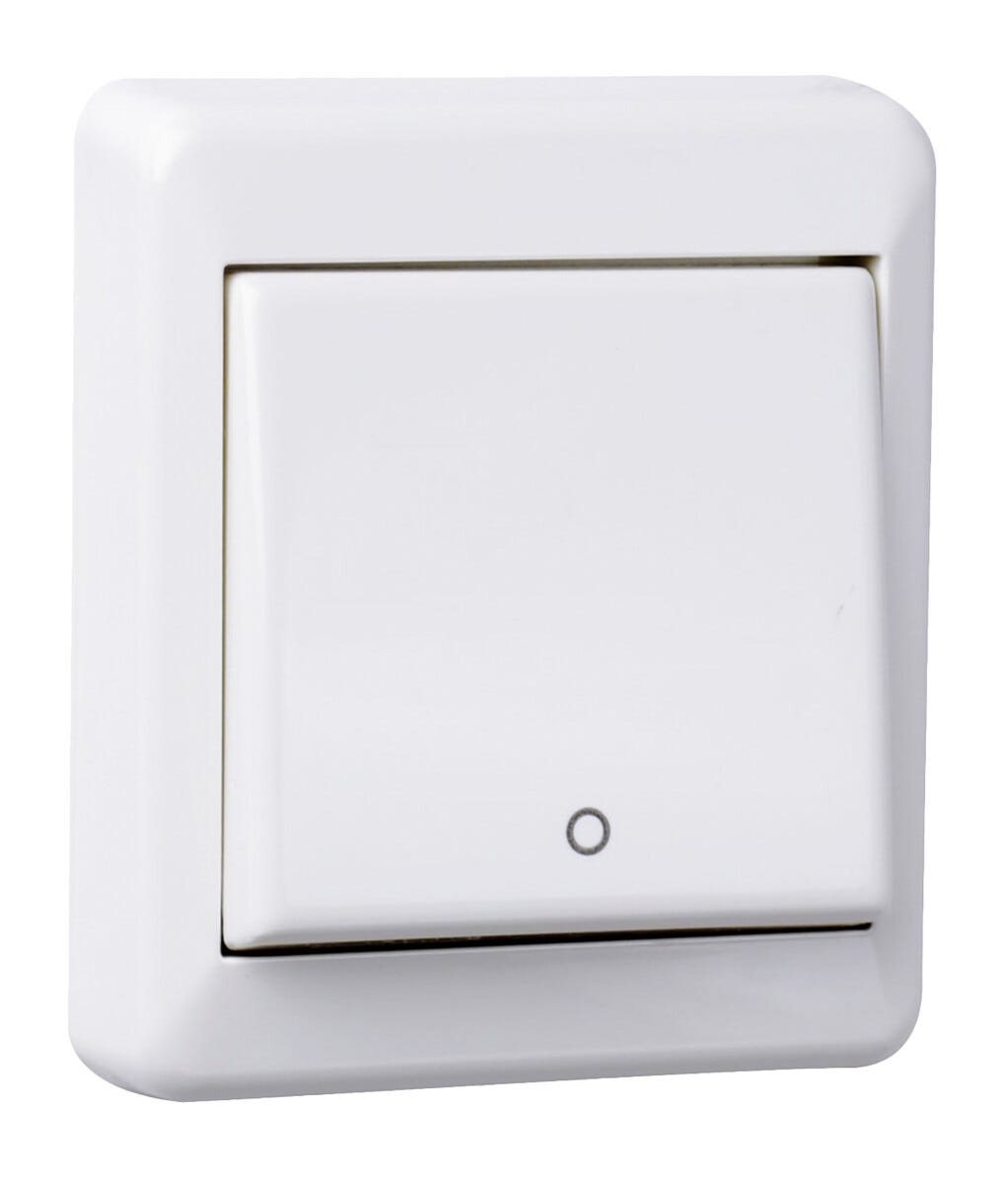 • Hvit strømbryter for utenpåliggende veggmontering innendørs.