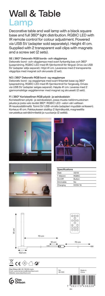 • Drives via USB. Fot, veggfeste og skruesett følger med. Høyde: 41 cm.