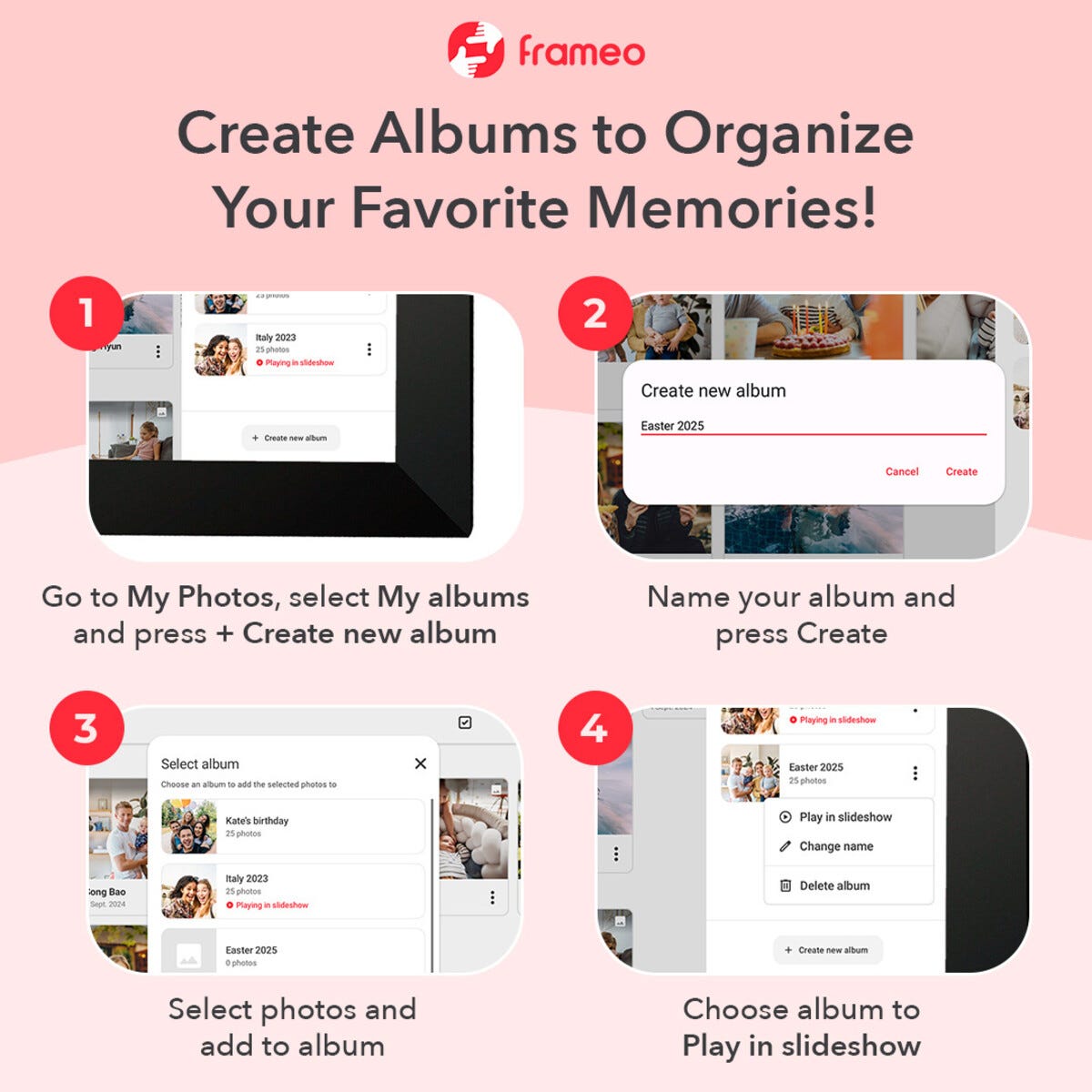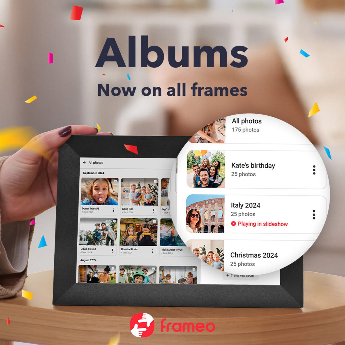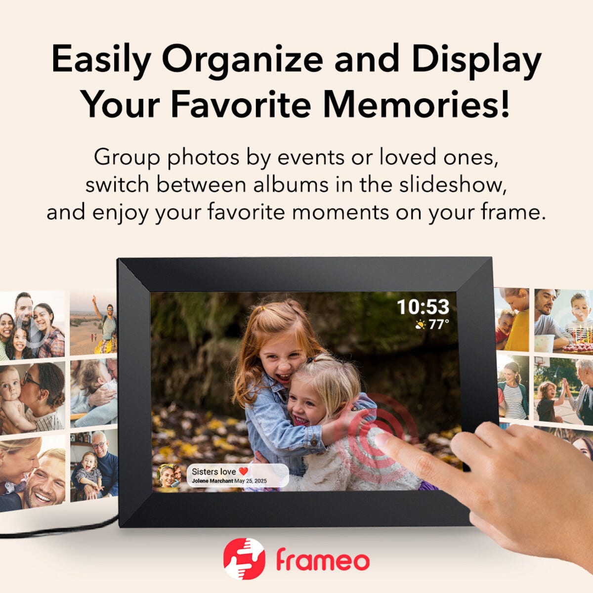 • Fleksibel digital fotoramme med wifi – del bilder fra mobilen via Frameo-appen.