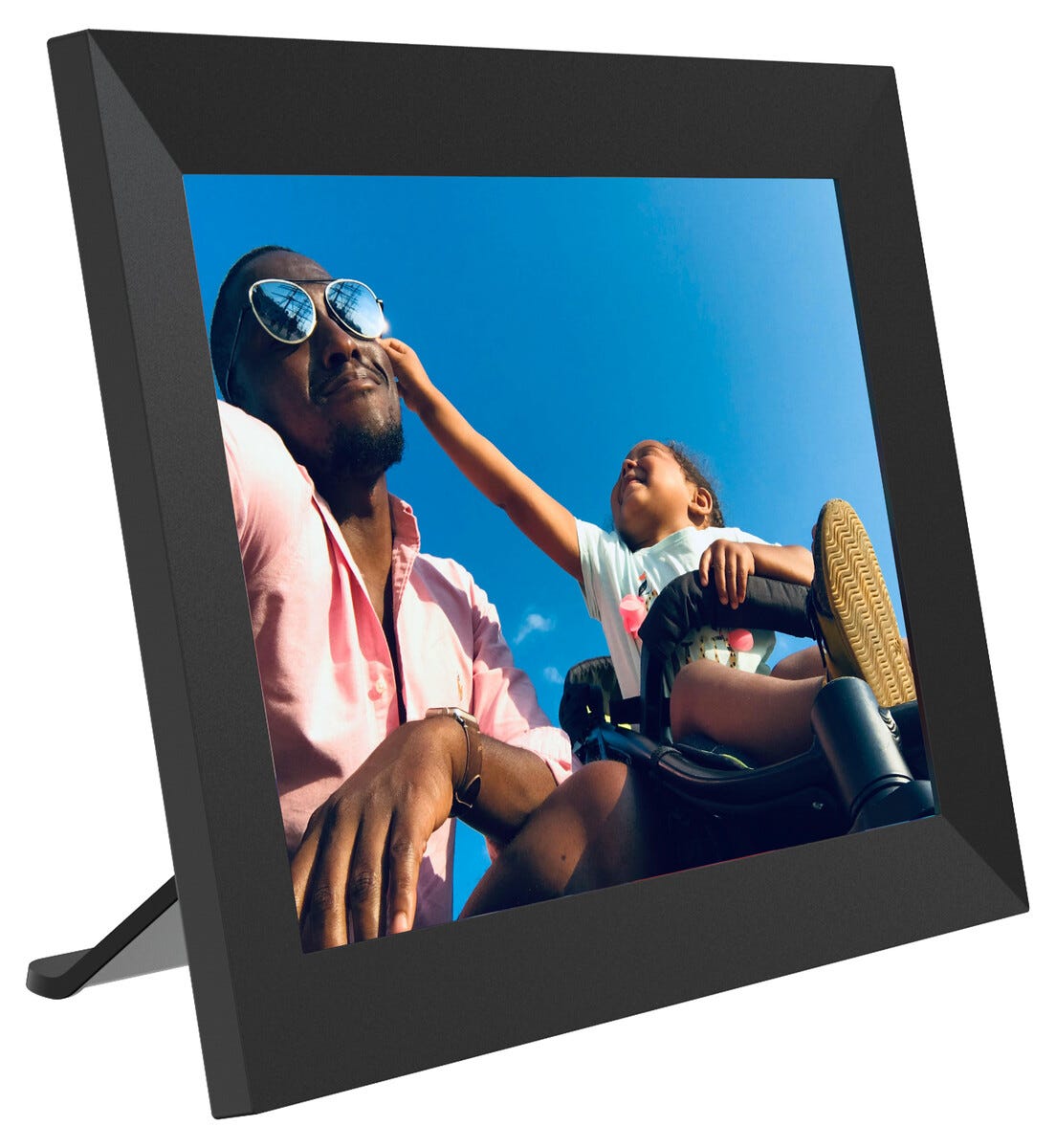 • Vis bilder i stående eller liggende format. Rammen kan stå fritt eller henges på veggen.