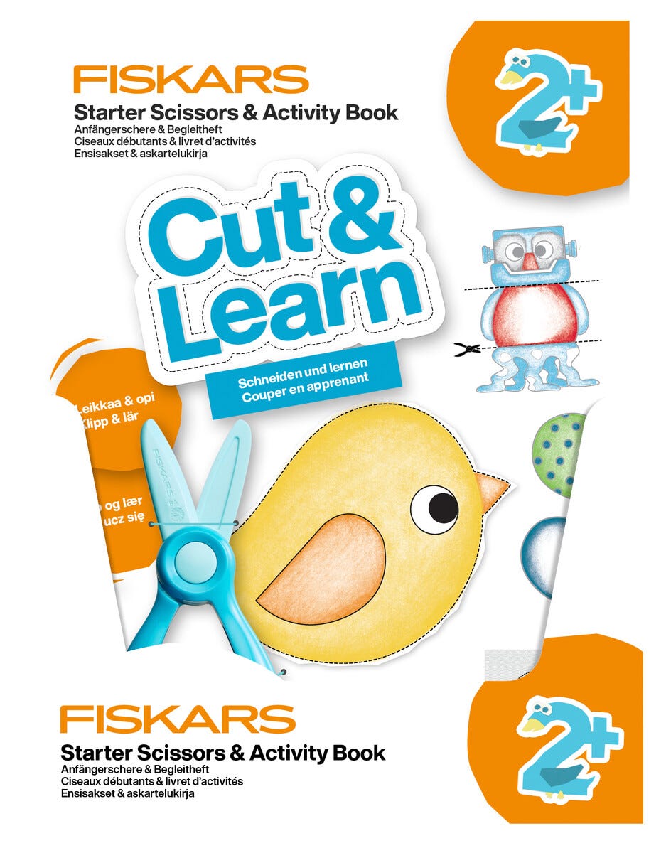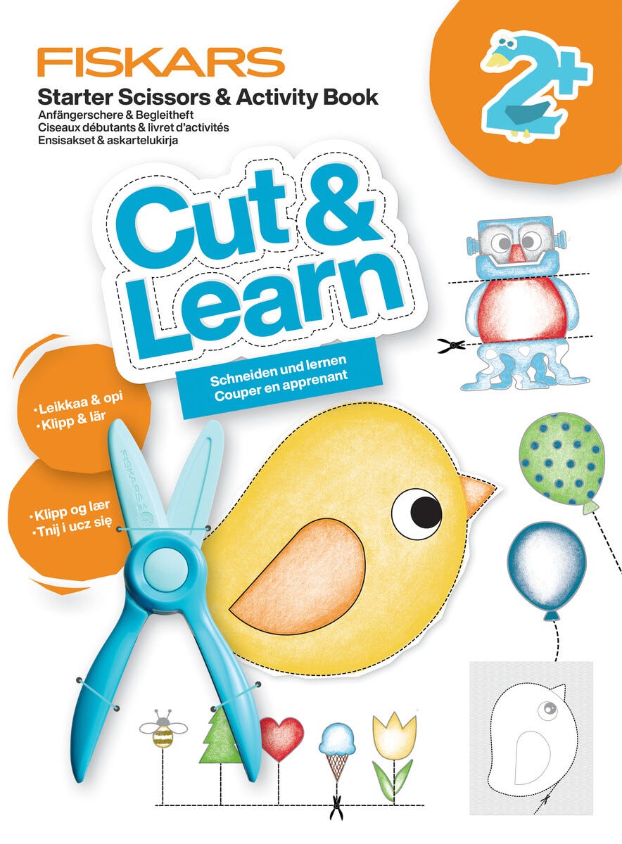 • Fiskars Cut & Learn barnesaks med plastblad samt bok, for barn fra 2 år.
