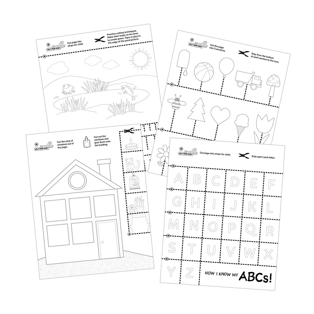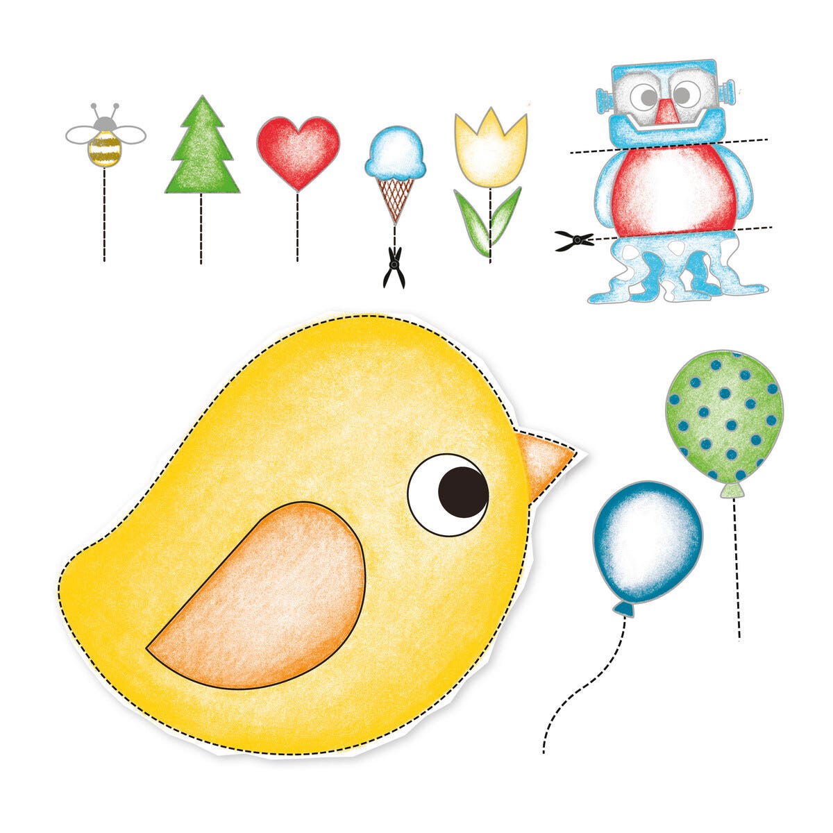 • Øvingsbok med 30 sider med aktiviteter – fargelegg og klipp.