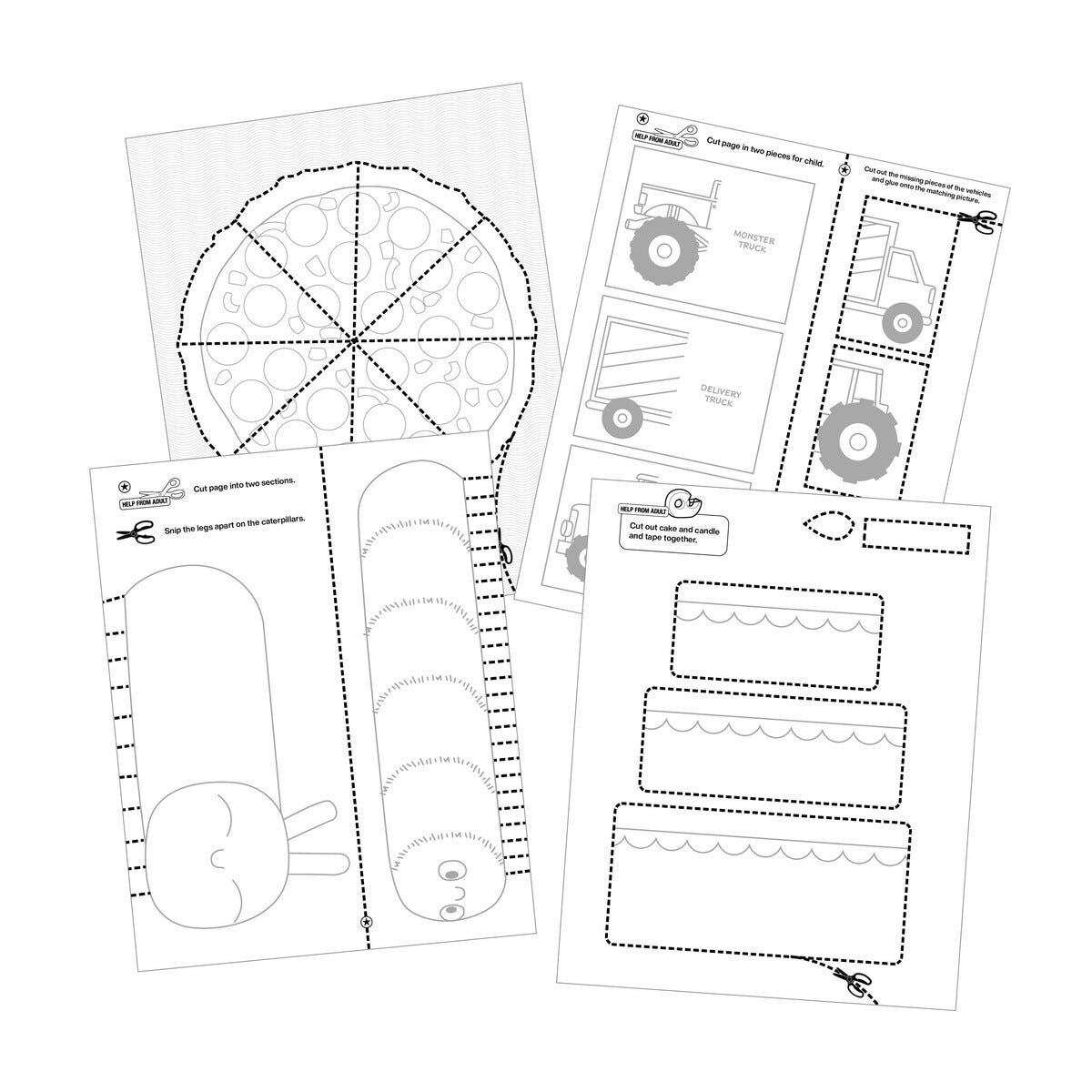 • Øv på å klippe med treningssaks i plast og en 30-siders aktivitetsbok.