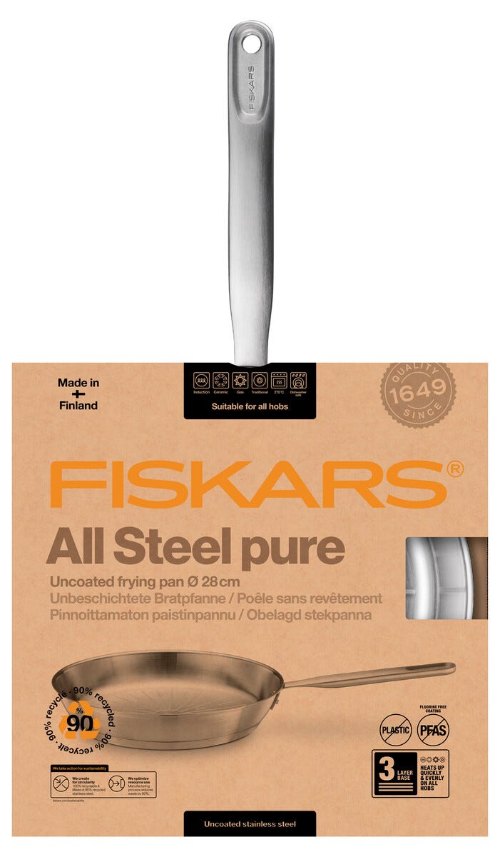 • Fiskars stekepanne All Steel Pure 28 cm – av 90 % gjenvunnet, rustfritt stål.