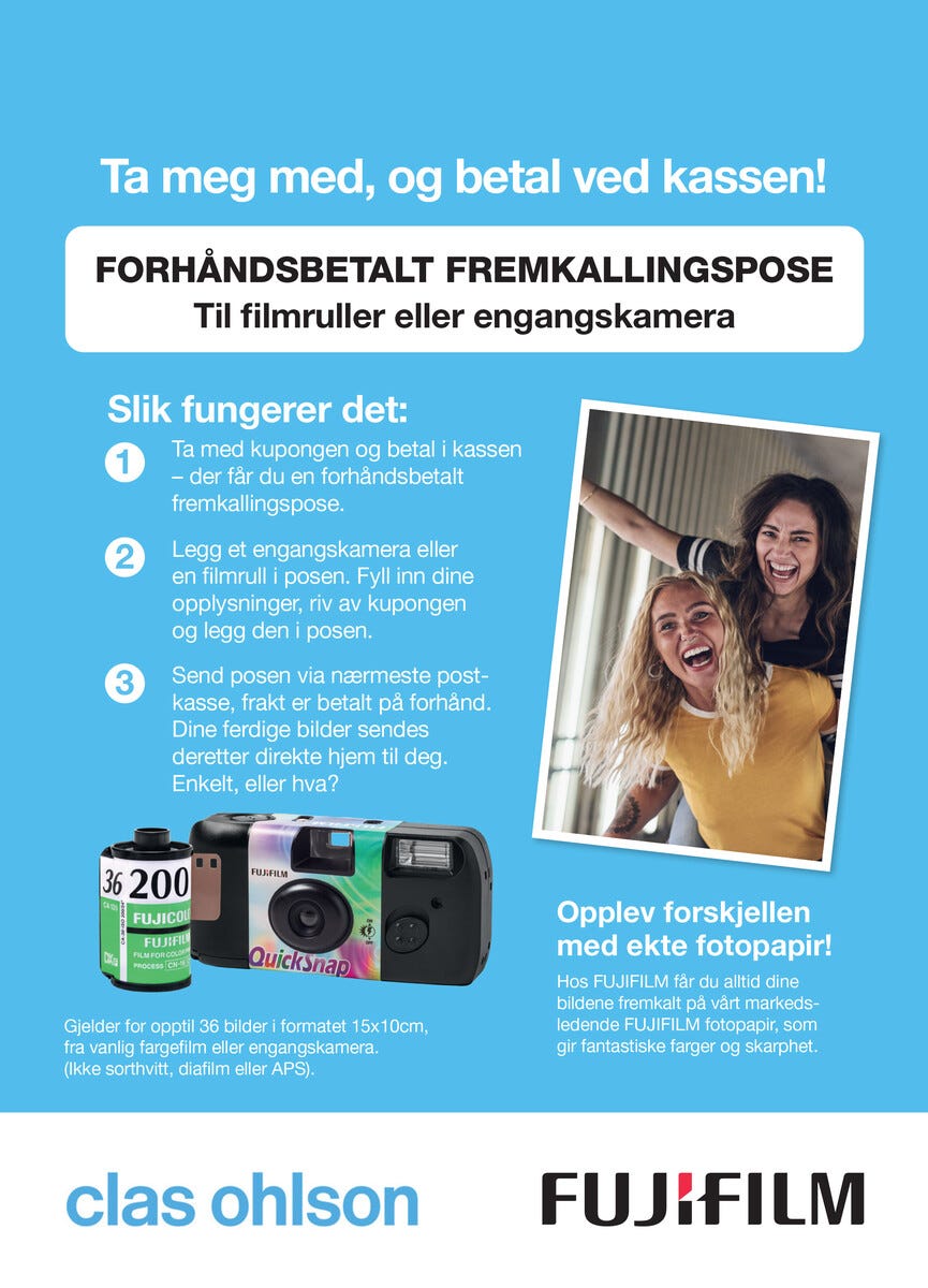 • Send inn en filmrull eller et engangskamera og få bildene ferdig fremkalt tilbake i posten.