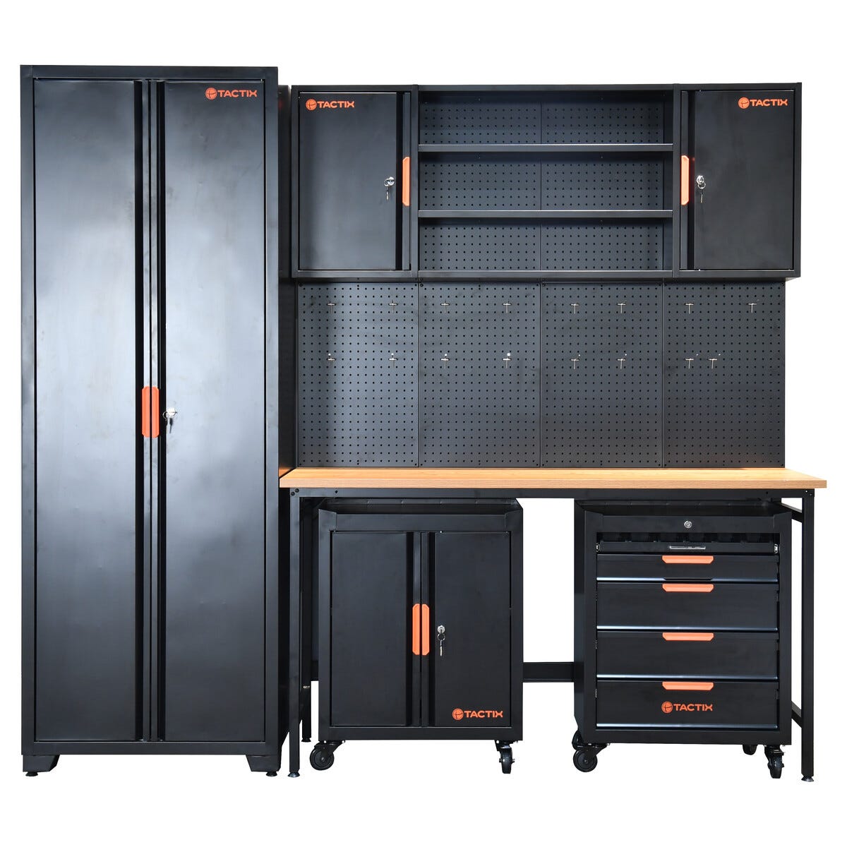 • Tactix garasjeinnredning – fleksibel oppbevaring med flyttbare hyller og rullbare verktøyskap.