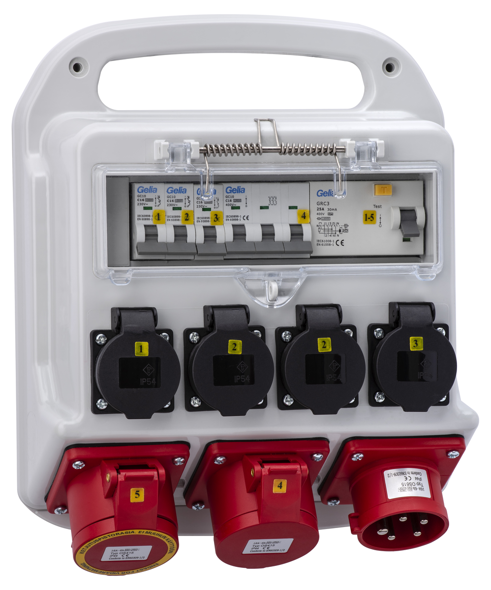 • Byggesentral Gelia med 2 x 400 V CEE-uttak og 4 x 230 V Schuko-uttak.