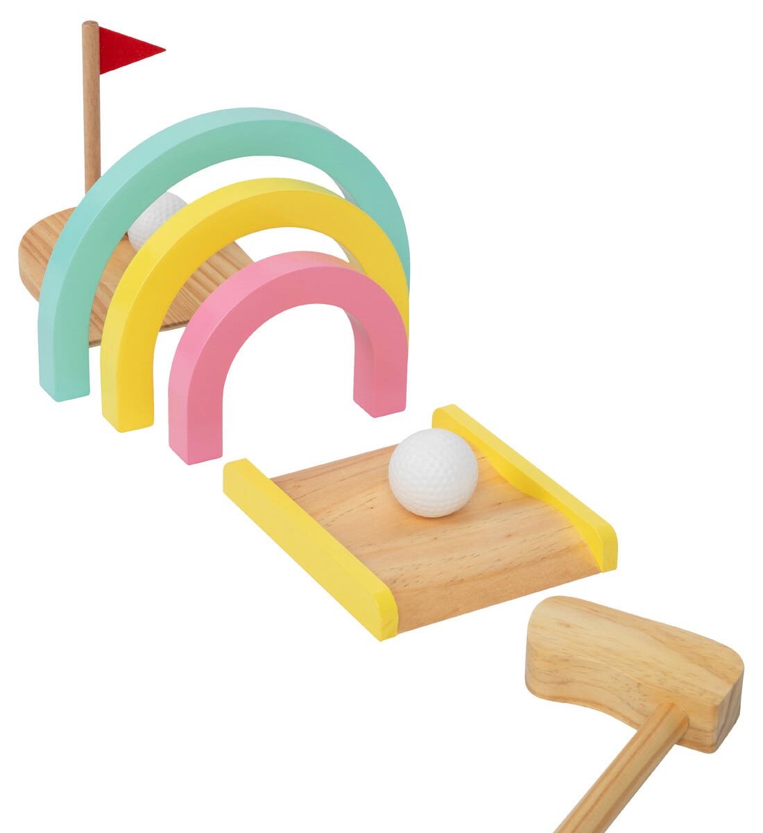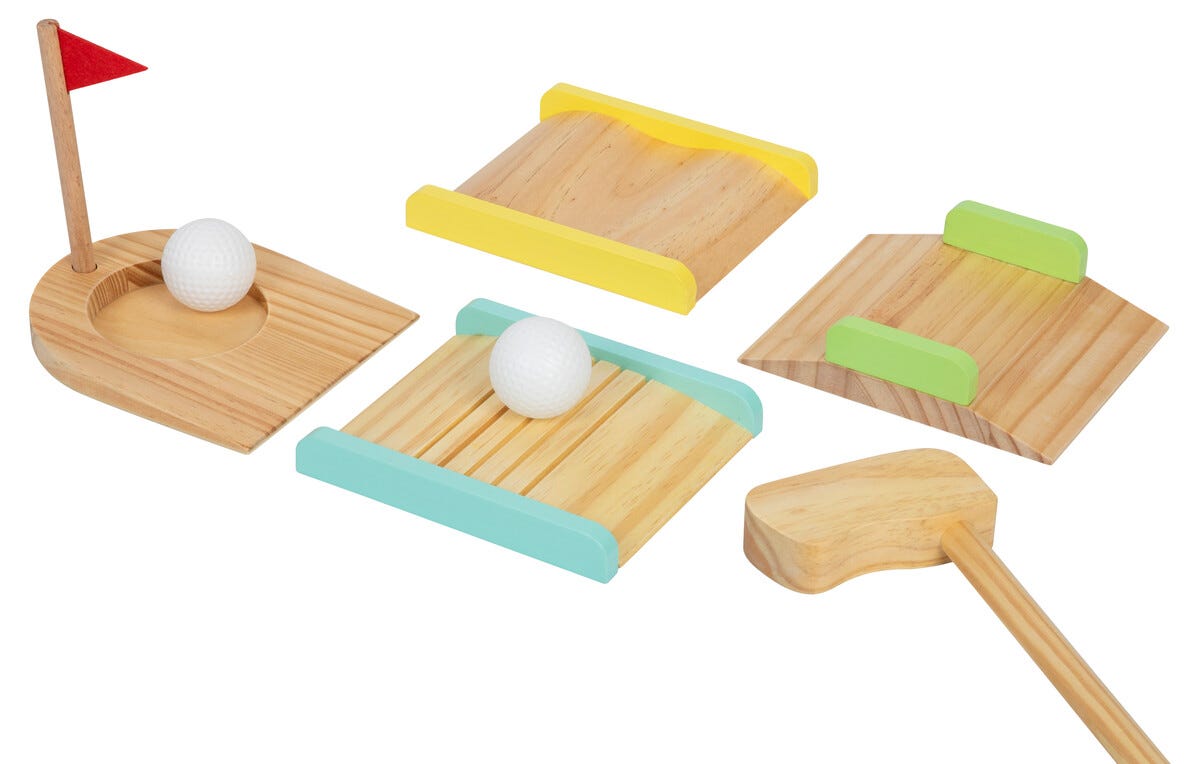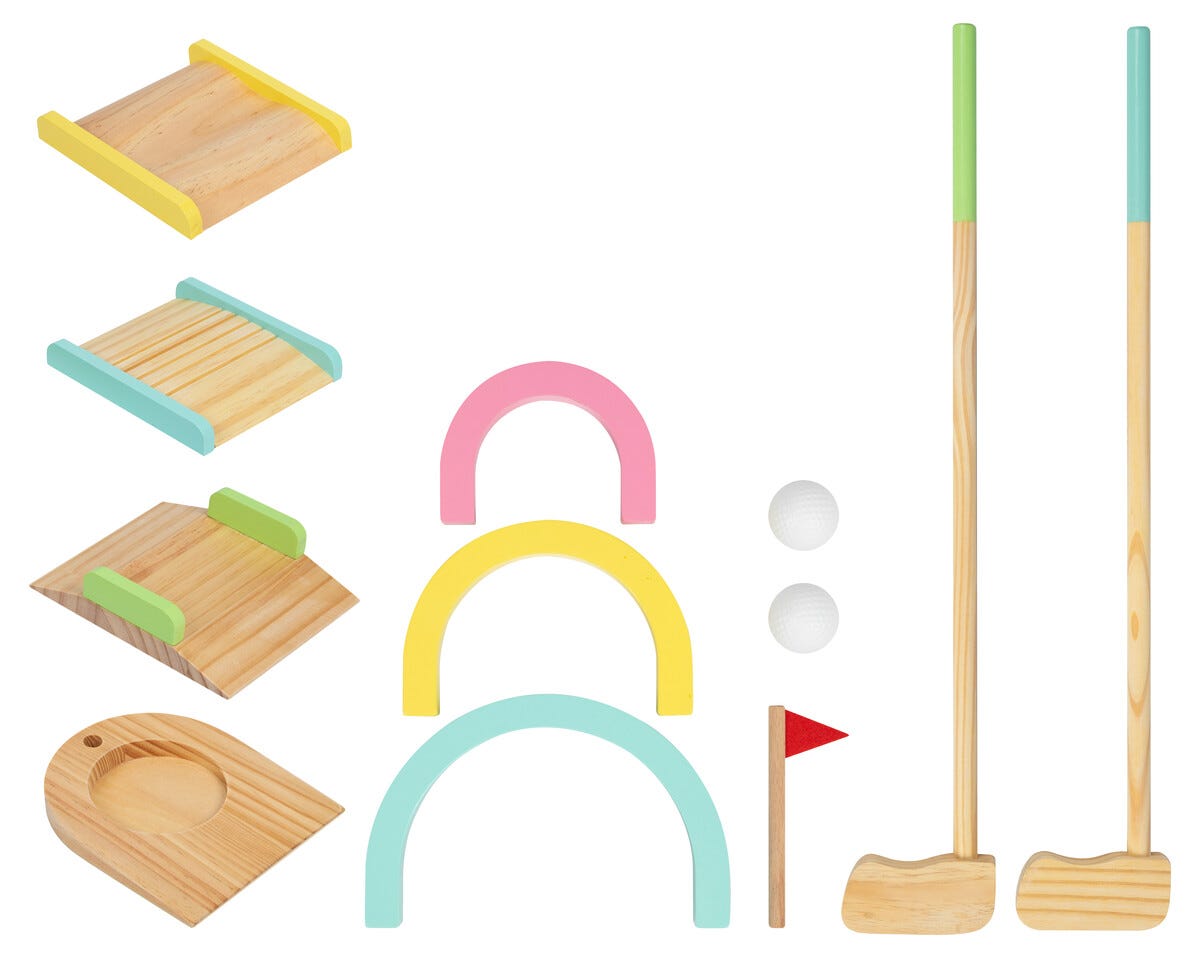 • Sett ut hull, bøyler og hinder – 2 golfkøller, 2 baller og tilbehør i tre.