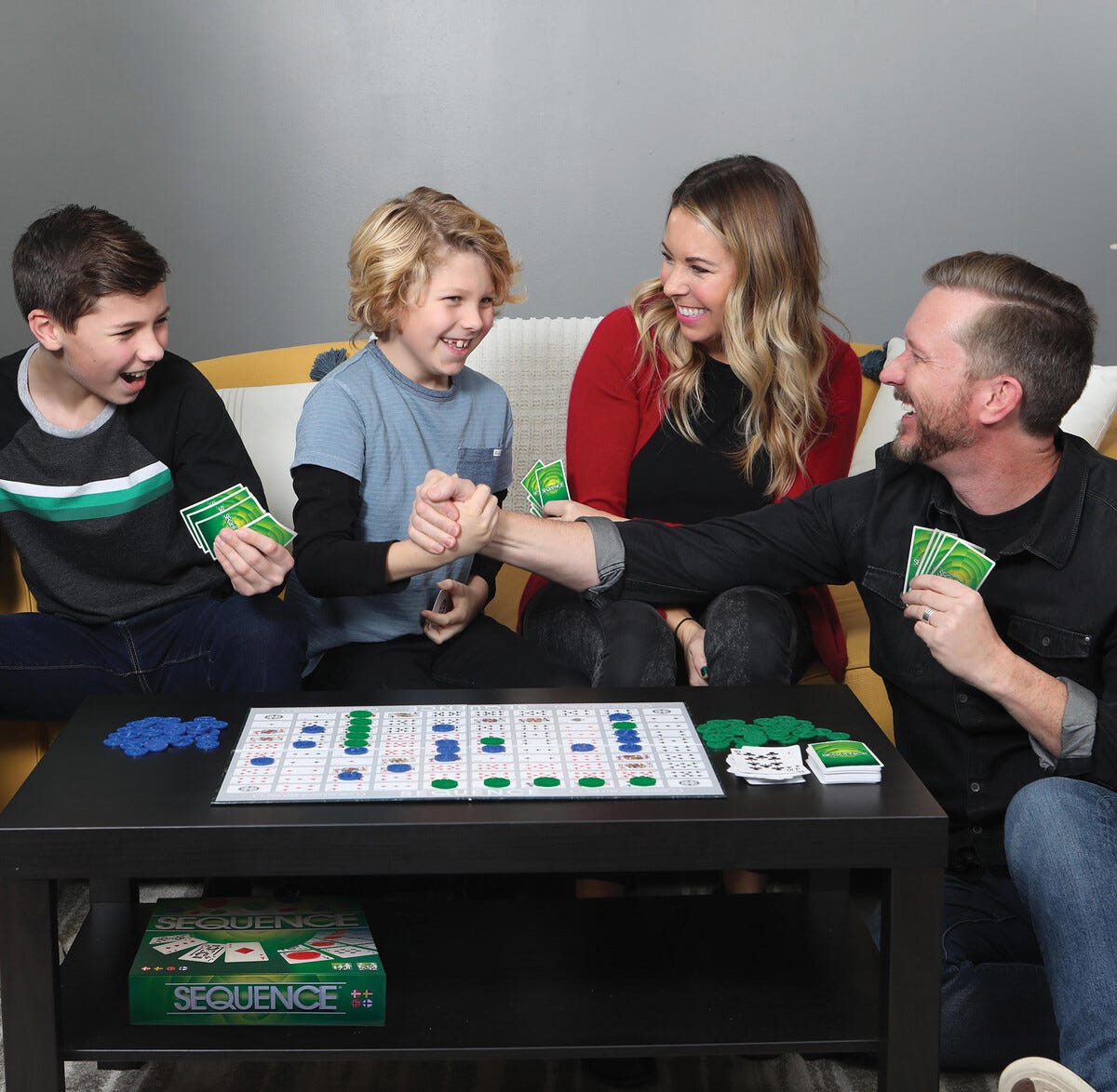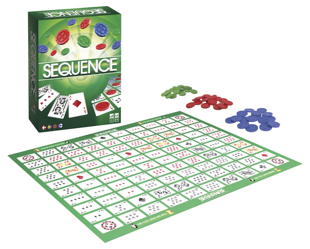 • 104 Sequence-kort, påminnelseskort, brikker i 3 farger og spillebrett.