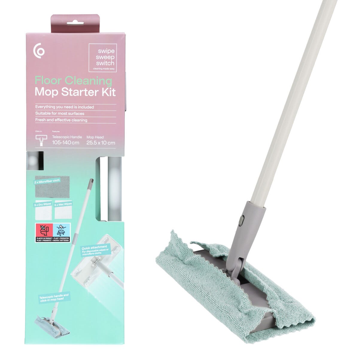 • Inneholder teleskopskaft, 5 tørrkluter, 5 våtkluter, 2 mikrofiberkluter.