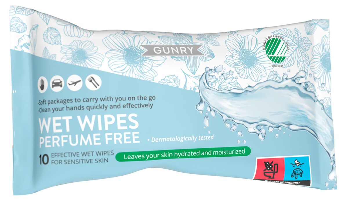 • 10 Svanemerkede våtservietter i emballasje som kan åpnes og lukkes.