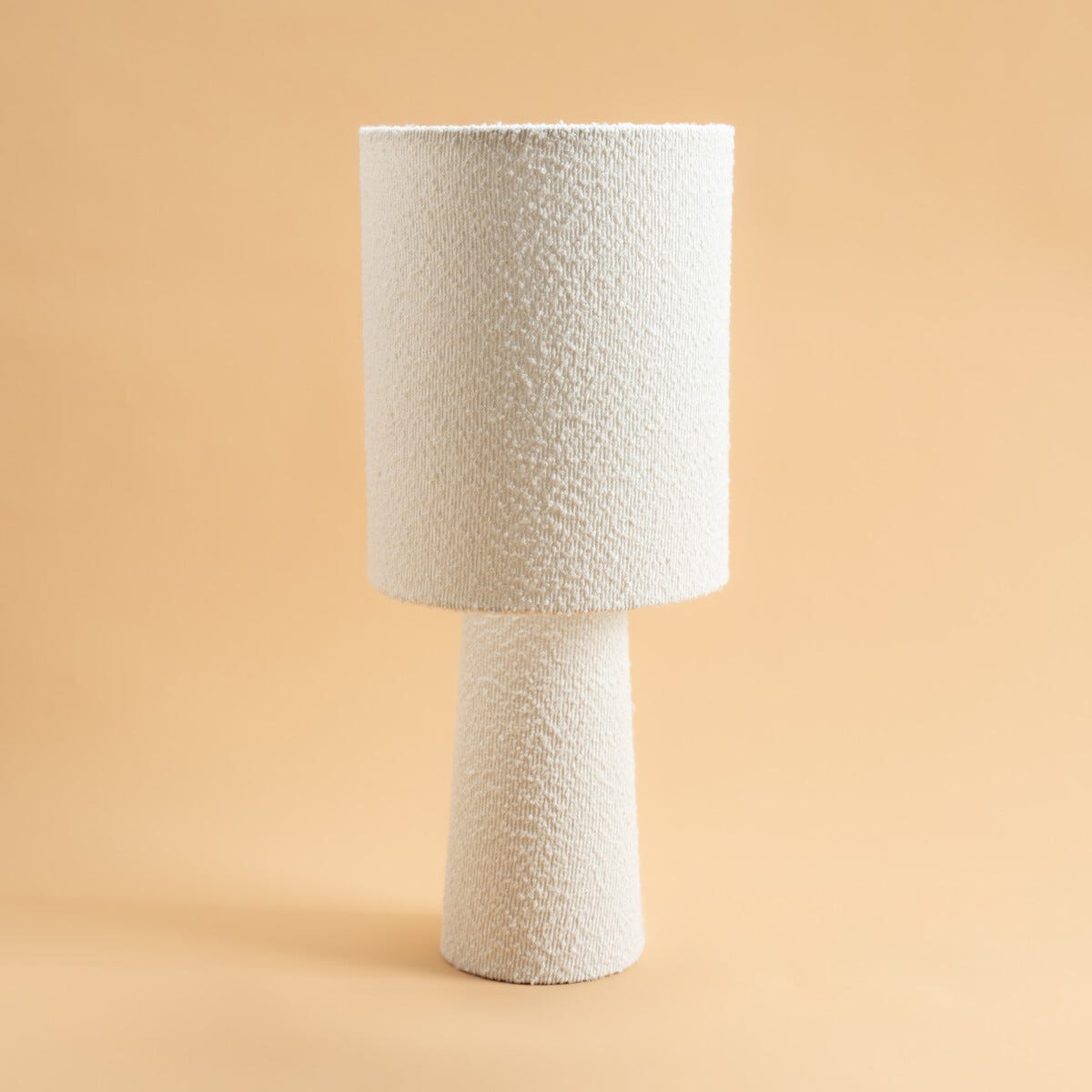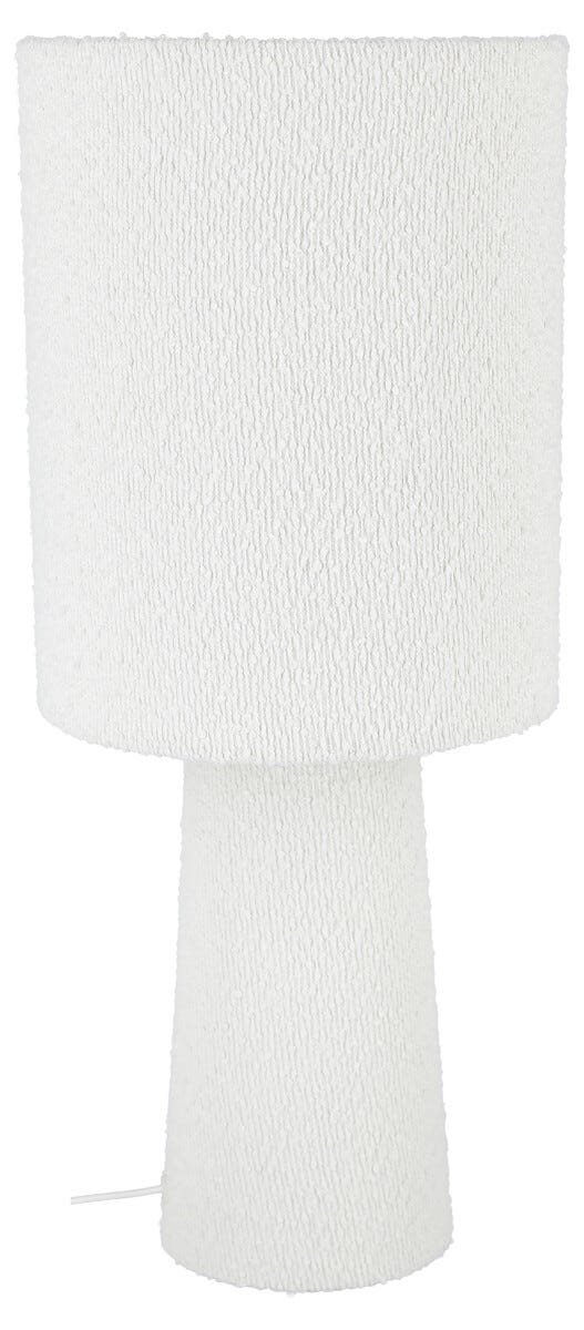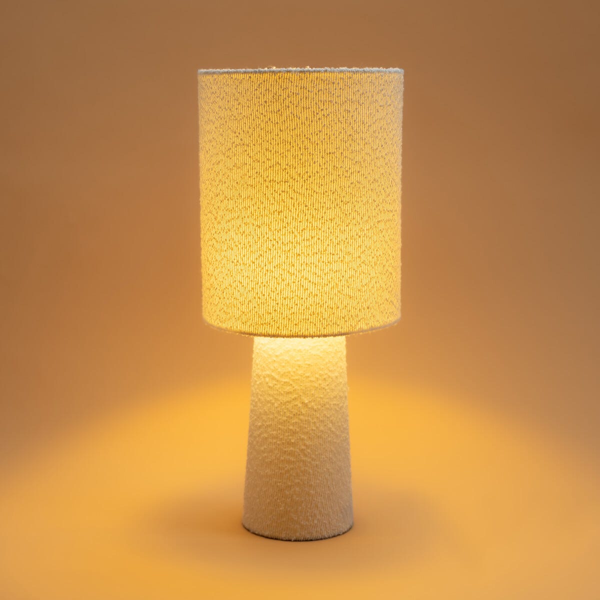 • Skjerm og fot trukket i stoff med bouclé-lignende struktur som sprer et mykt skjær.