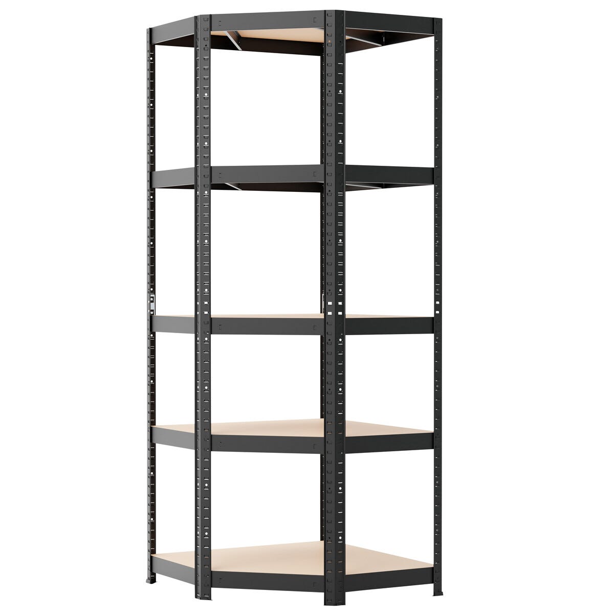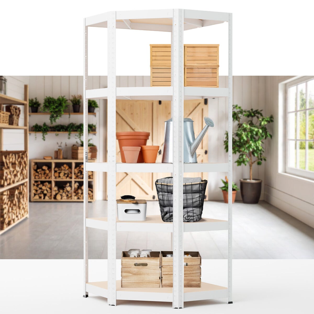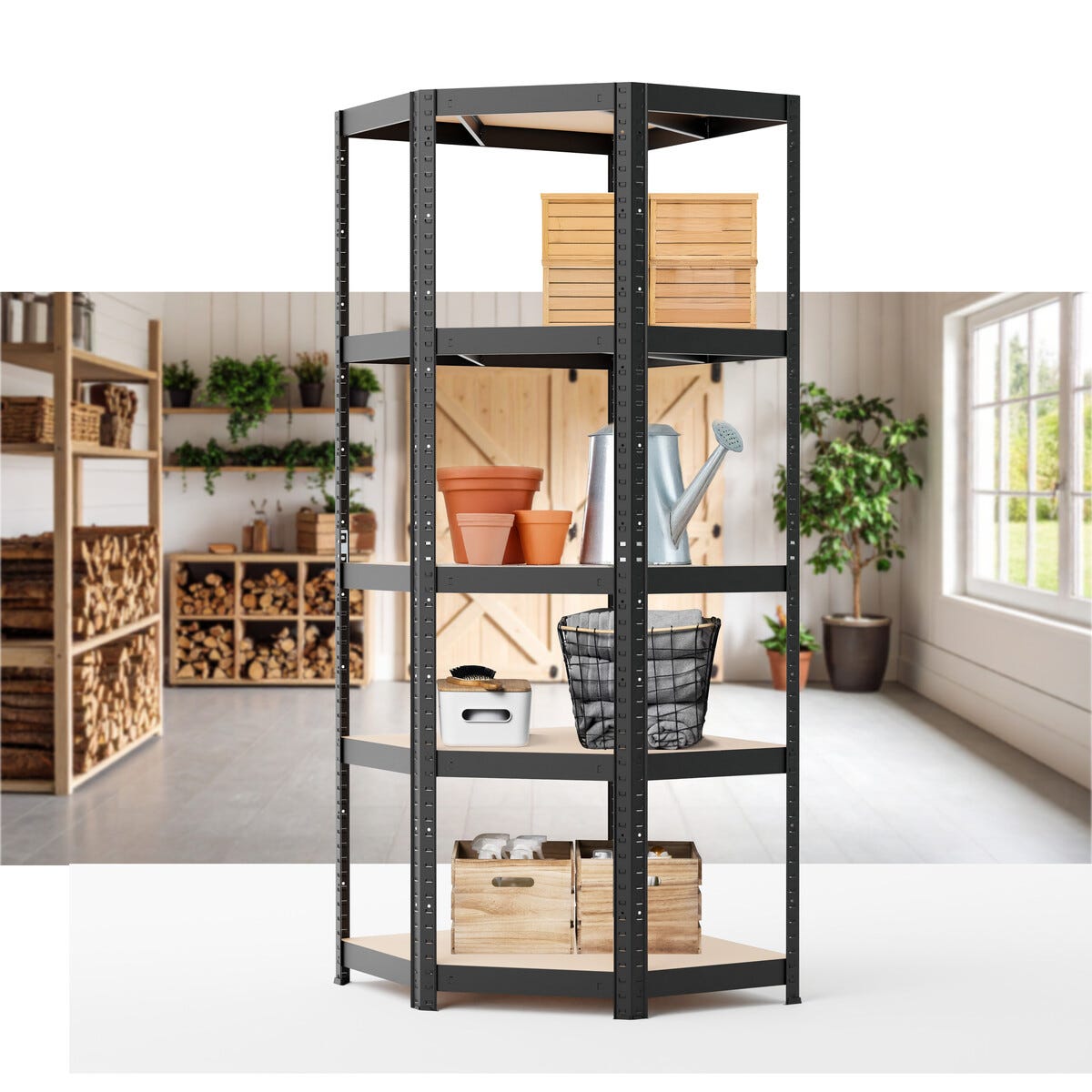 Hjørnehylle i metall for garasje eller bod, 5 hylleplater
