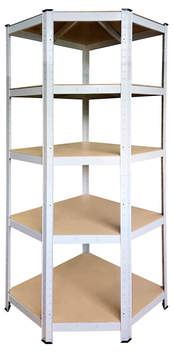 Hjørnehylle i metall for garasje eller bod, 5 hylleplater
