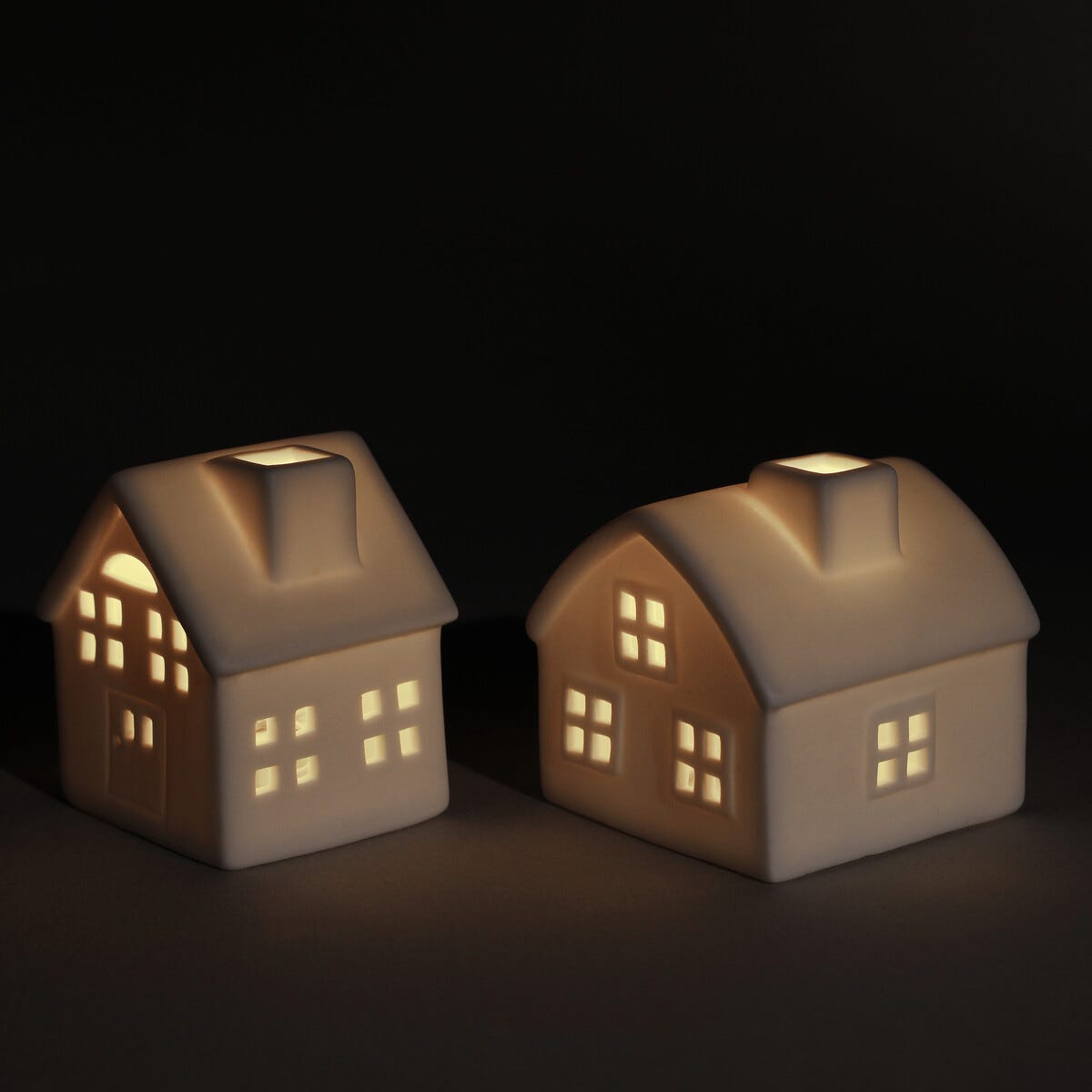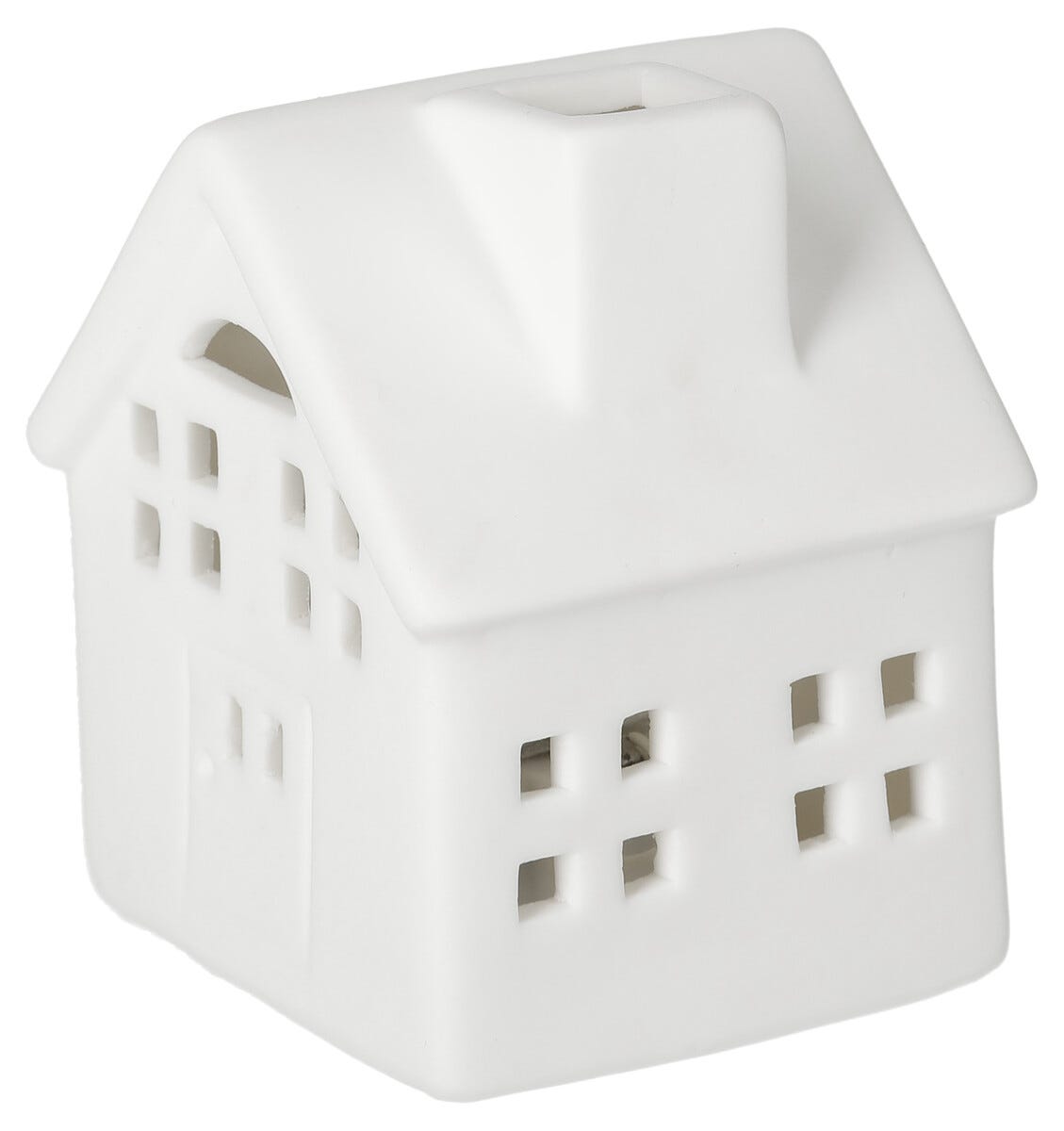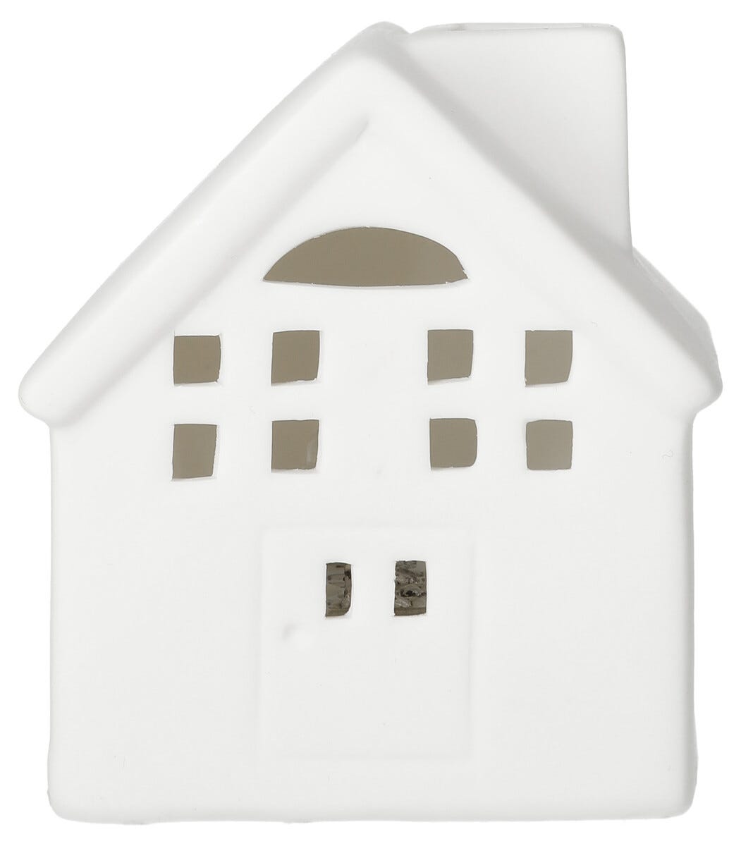 • Lite, hvitt hus i keramikk med LED-belysning og timer.