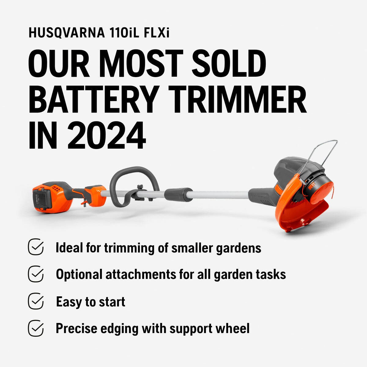 • Husqvarna 110iL FLXi – batteridrevet gresstrimmer med dobbel trimmertråd.