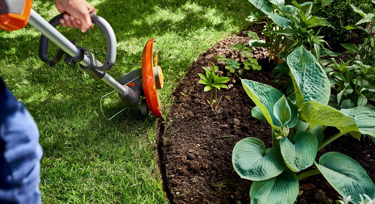 • Gresstrimmer med sammenleggbart plantevern – trimmer trygt rundt planter og kanter.