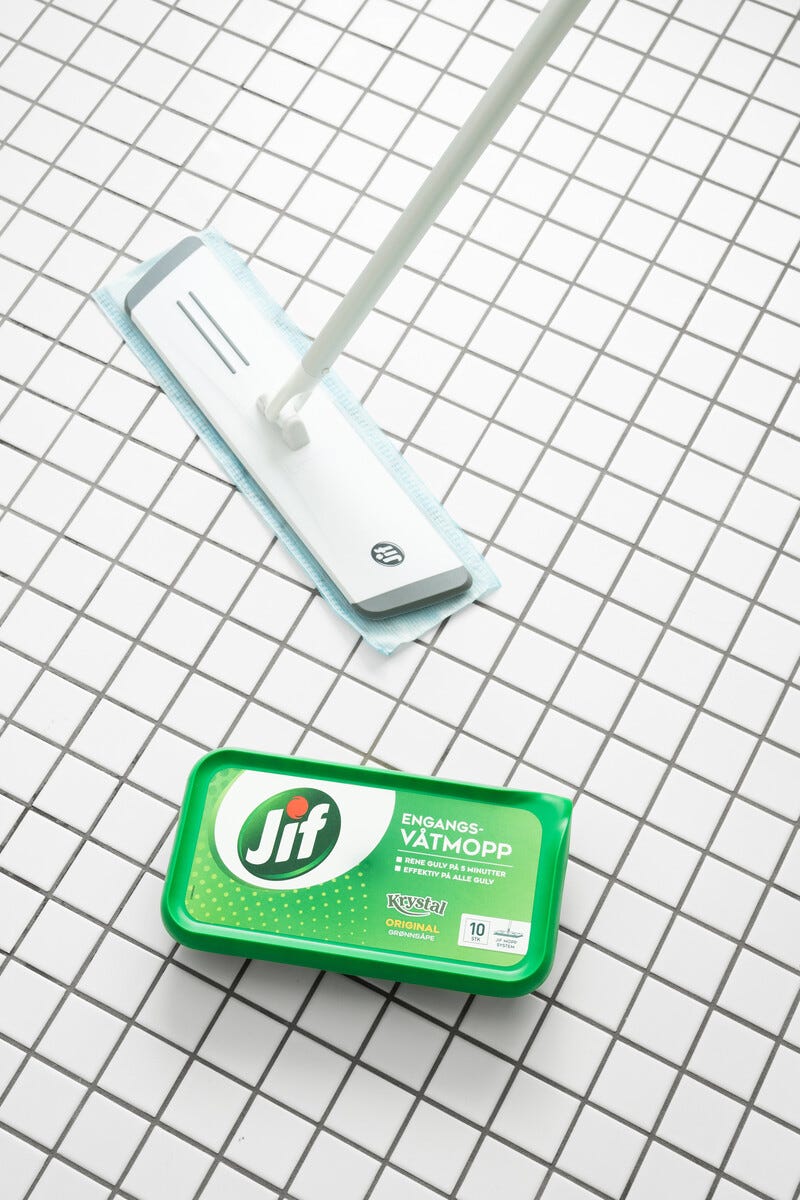 • Jif engangsmopp Krystal Original – gir en frisk duft av grønnsåpe.