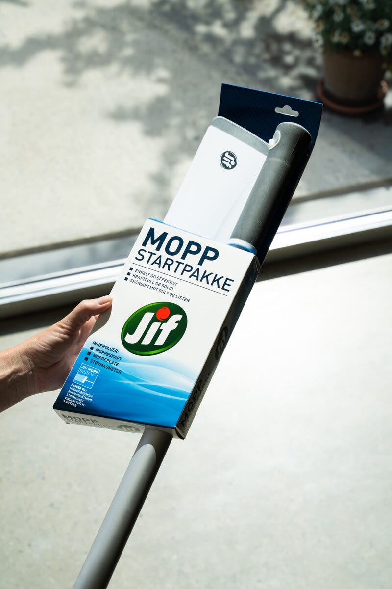 • Jif mopp startpakke med teleskopskaft og 2 tørrmopper.