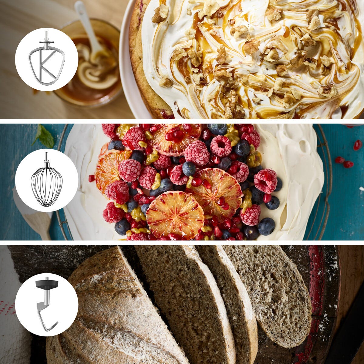• 4 robuste verktøy følger med: visp, deigkrok, K-visp og blender.