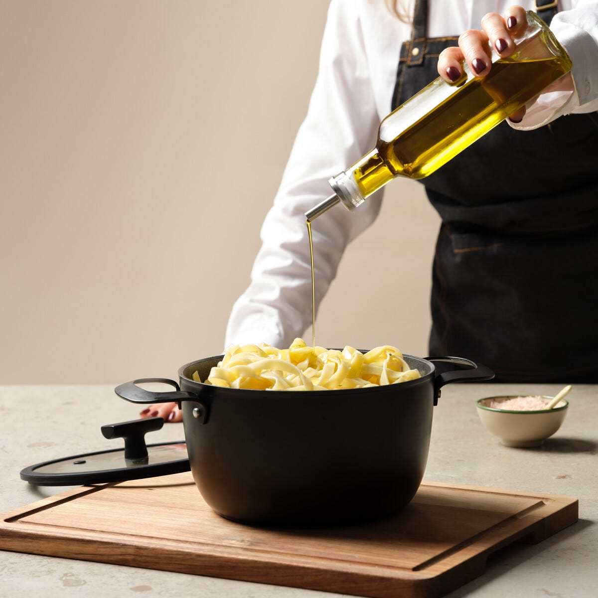 • Gripevennlig gryte med håndtak i rustfritt stål – til alle typer komfyrer, også stekeovn.