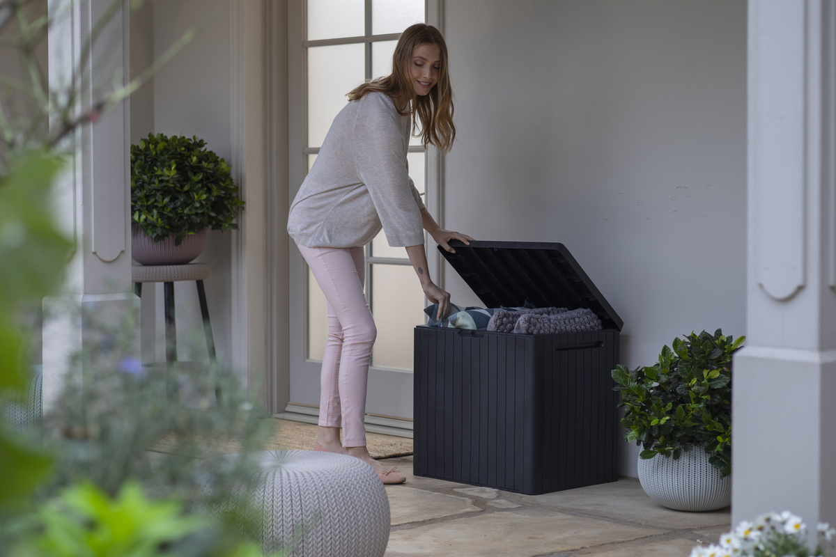 • Praktisk oppbevaringsboks til f.eks. balkongen eller uteplassen.