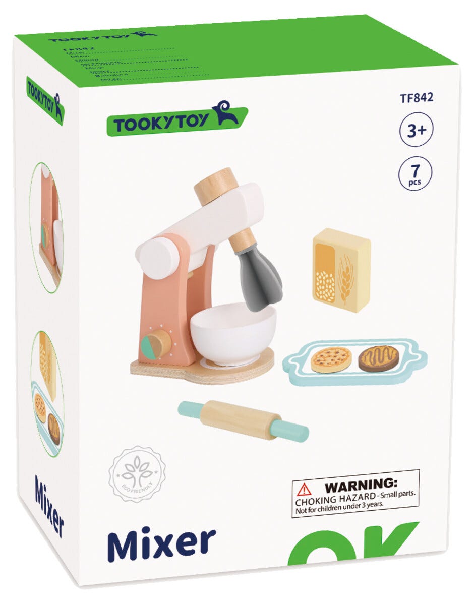 • Kjøkkenmaskin for barn – med 7 deler i tre; maskin, bolle, baketilbehør med mer.