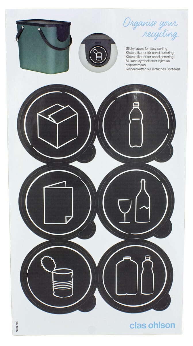 Ett ark med klistremerker til kildesorteringsdunker. Arket inneholder 6 ulike symboler, med mål 6 cm, slik at du kan merke forskjellige beholdere med hva de inneholder.
