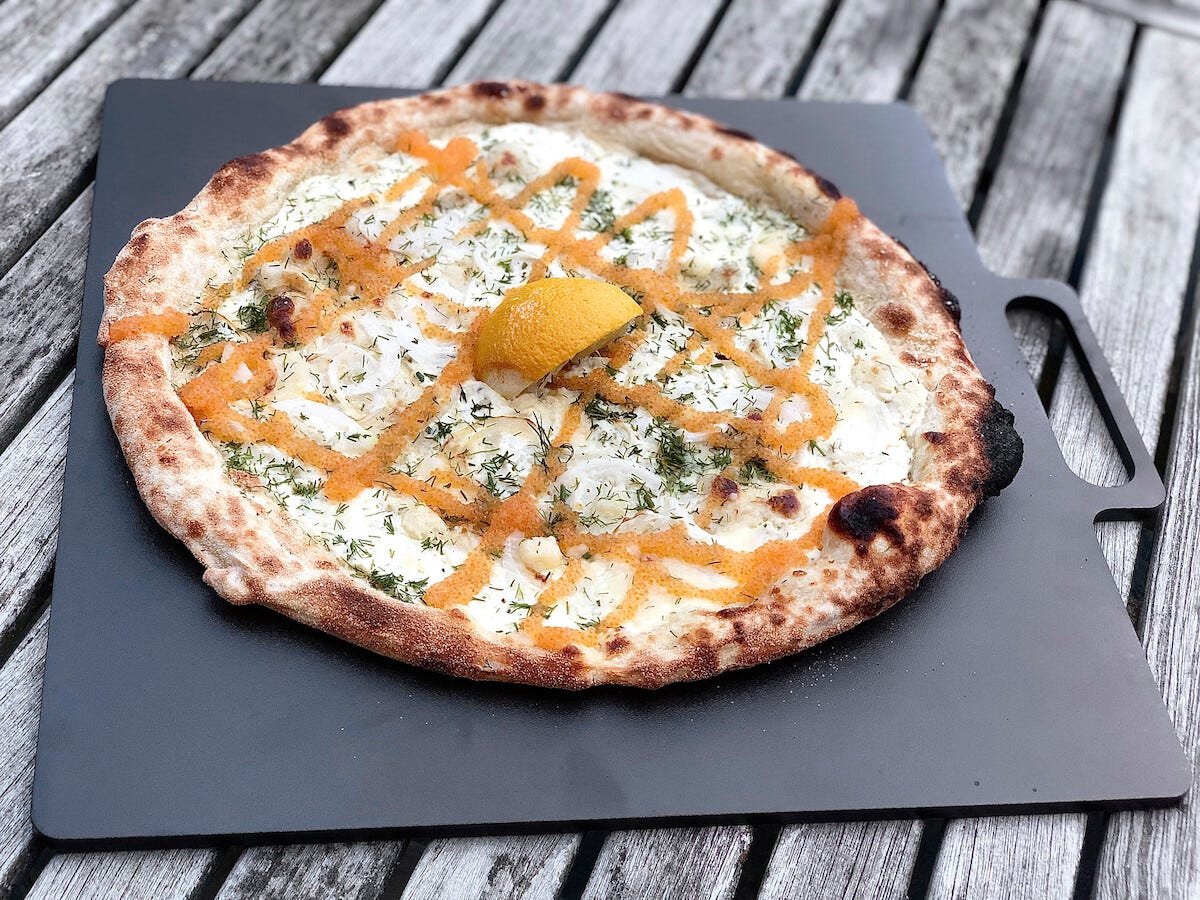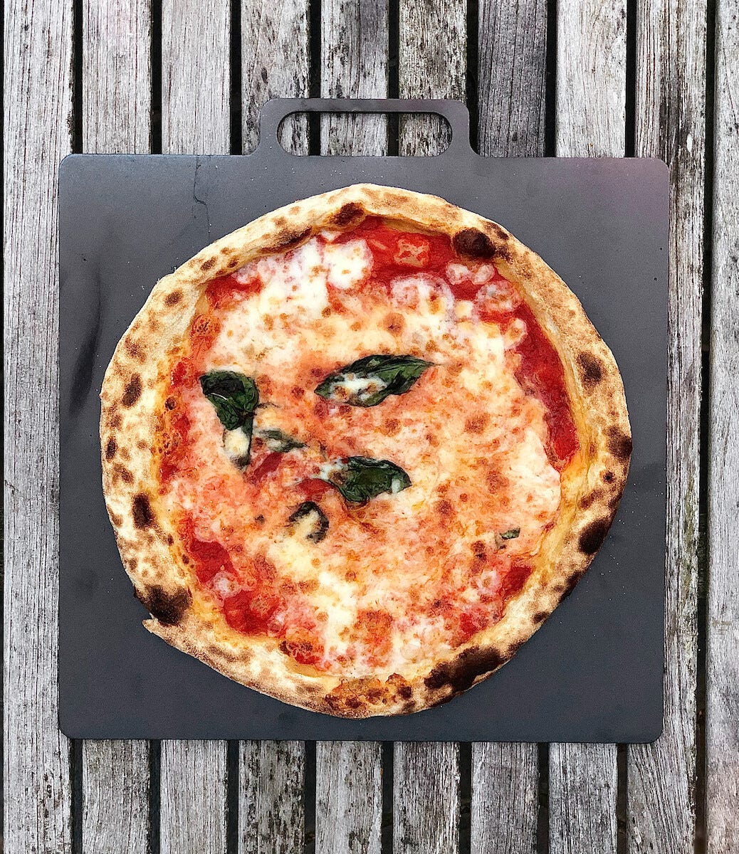• Pizzastål som er klart til bruk (forhåndsinnstekt med olje) – bak som på en pizzarestaurant.