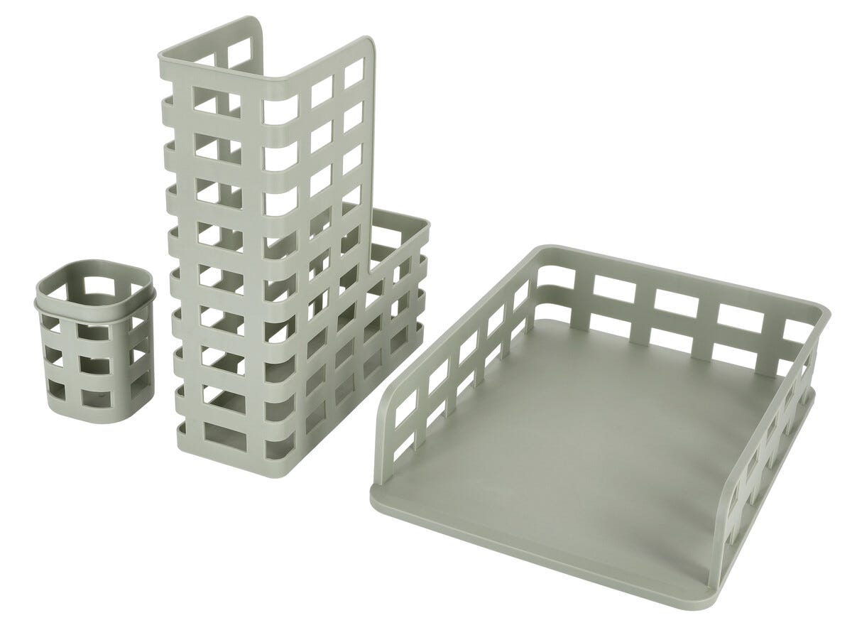 Kontorsett med dokumentordner, penneholder og brevkurv