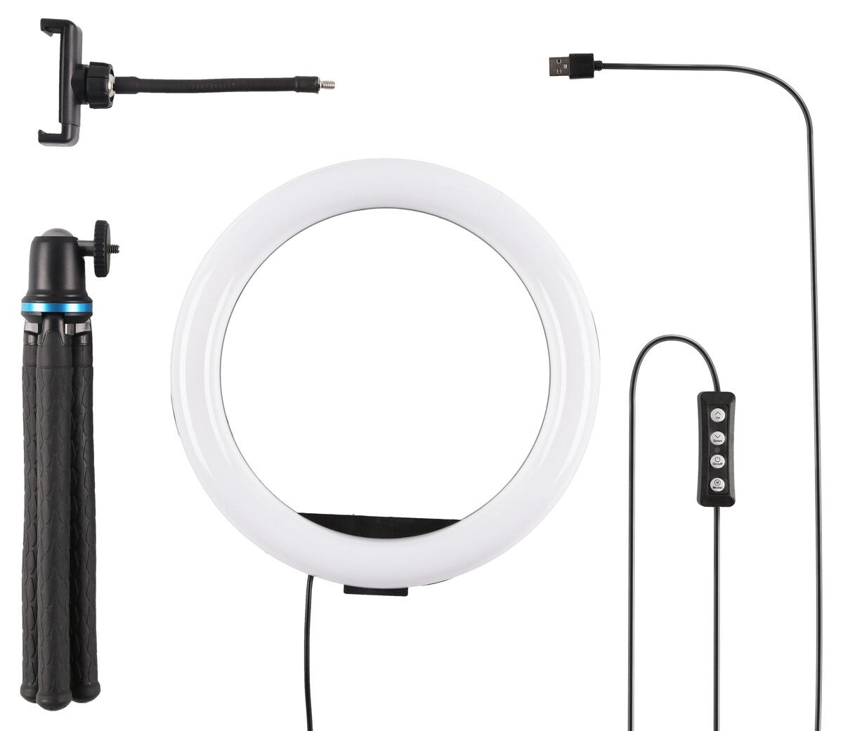 • 10-tommers LED-ringlys – klemfeste for mobiltelefon: 65–95 mm.