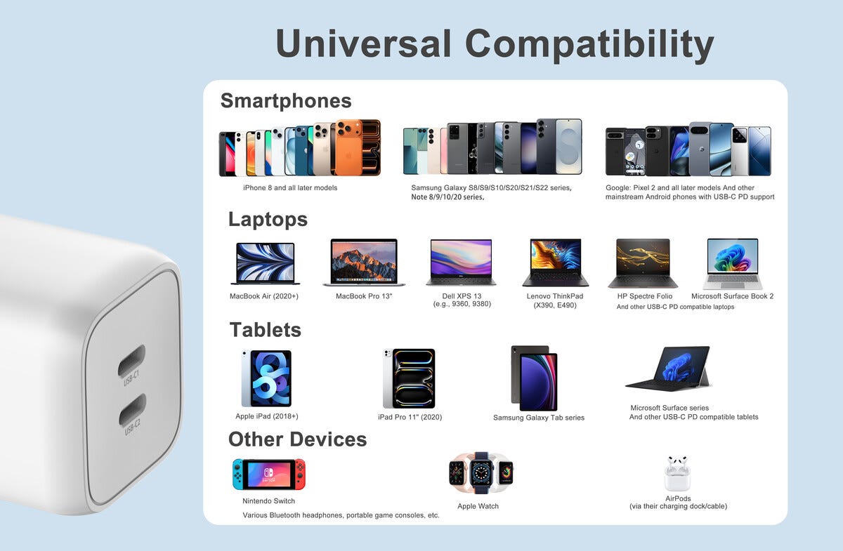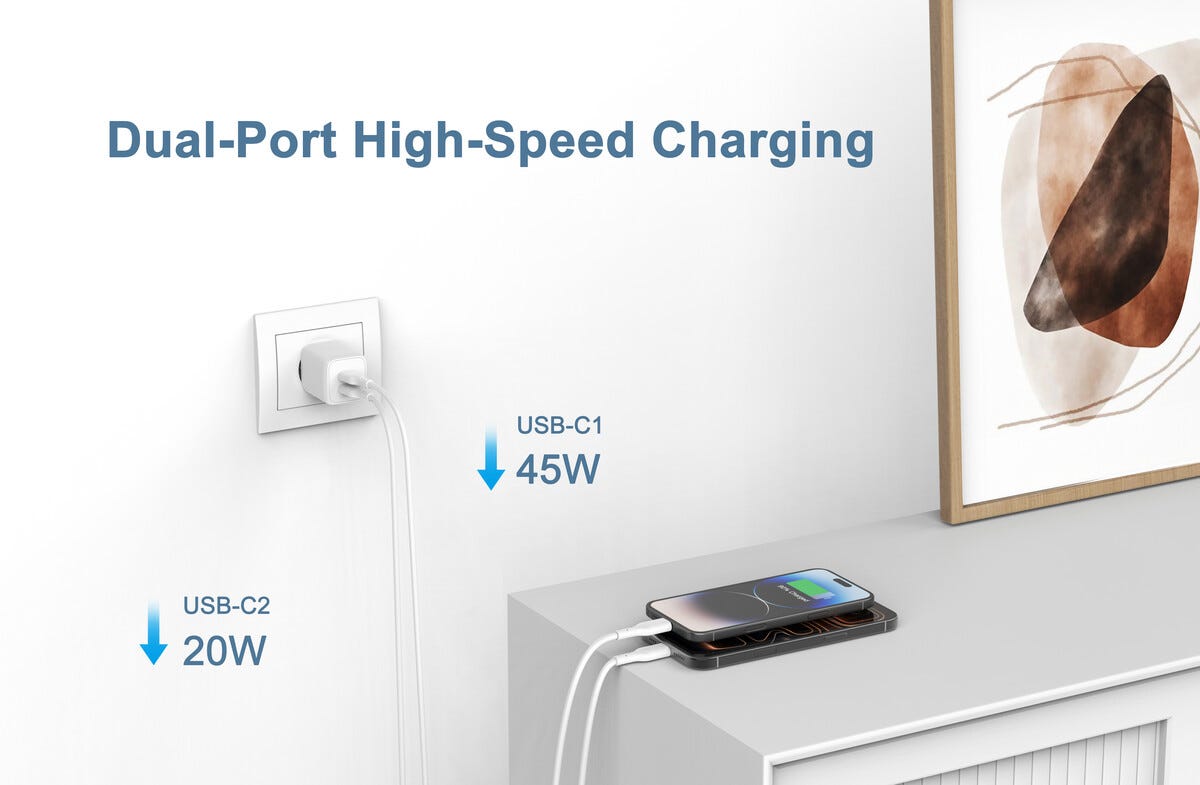 • Kompakt USB-C-lader med 2 USB-C-uttak.