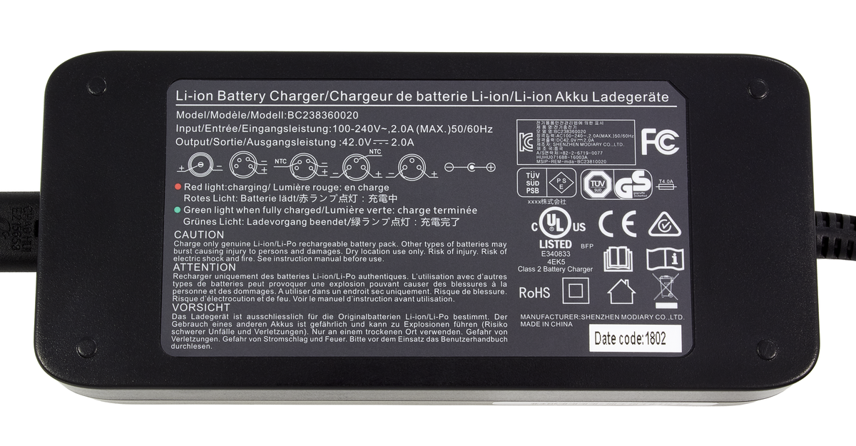 Batterilader til elsykkel Off Course, art. nr. 31-1187 (-1,-2,-3). Ikke original.