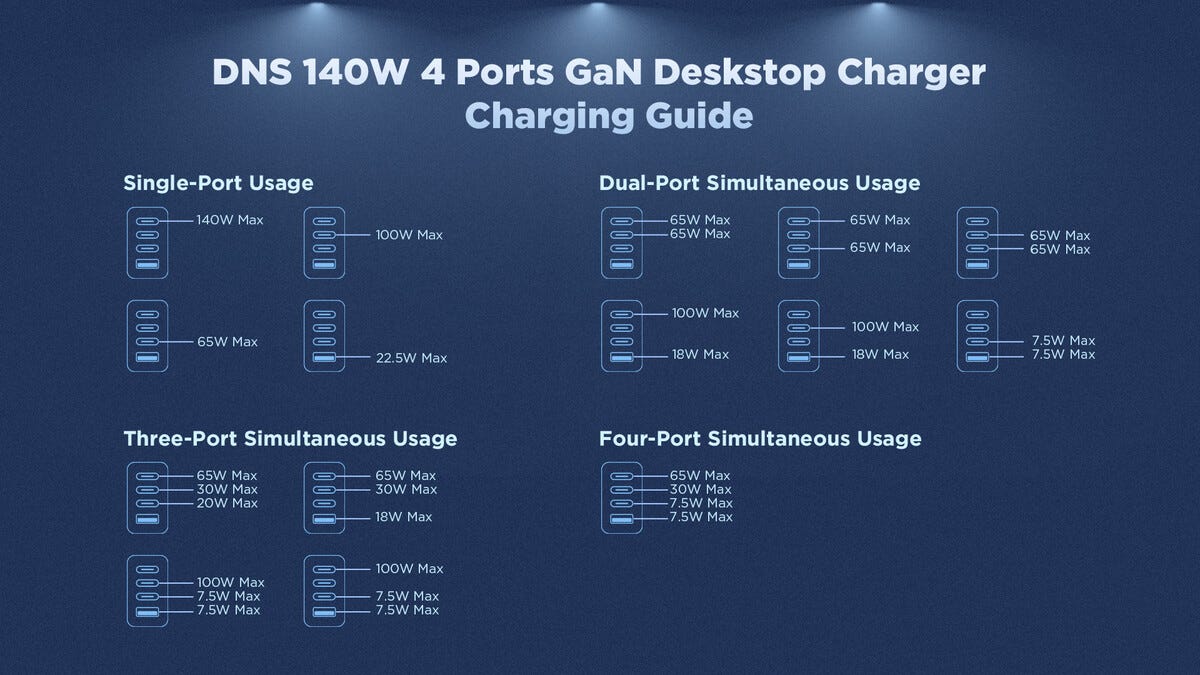 Ladestasjon USB-C/A 4 porter GaN PD, 140 W