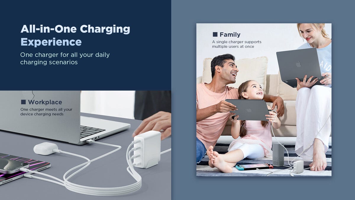• Ladestasjon med USB-C/A og fire porter for rask lading.