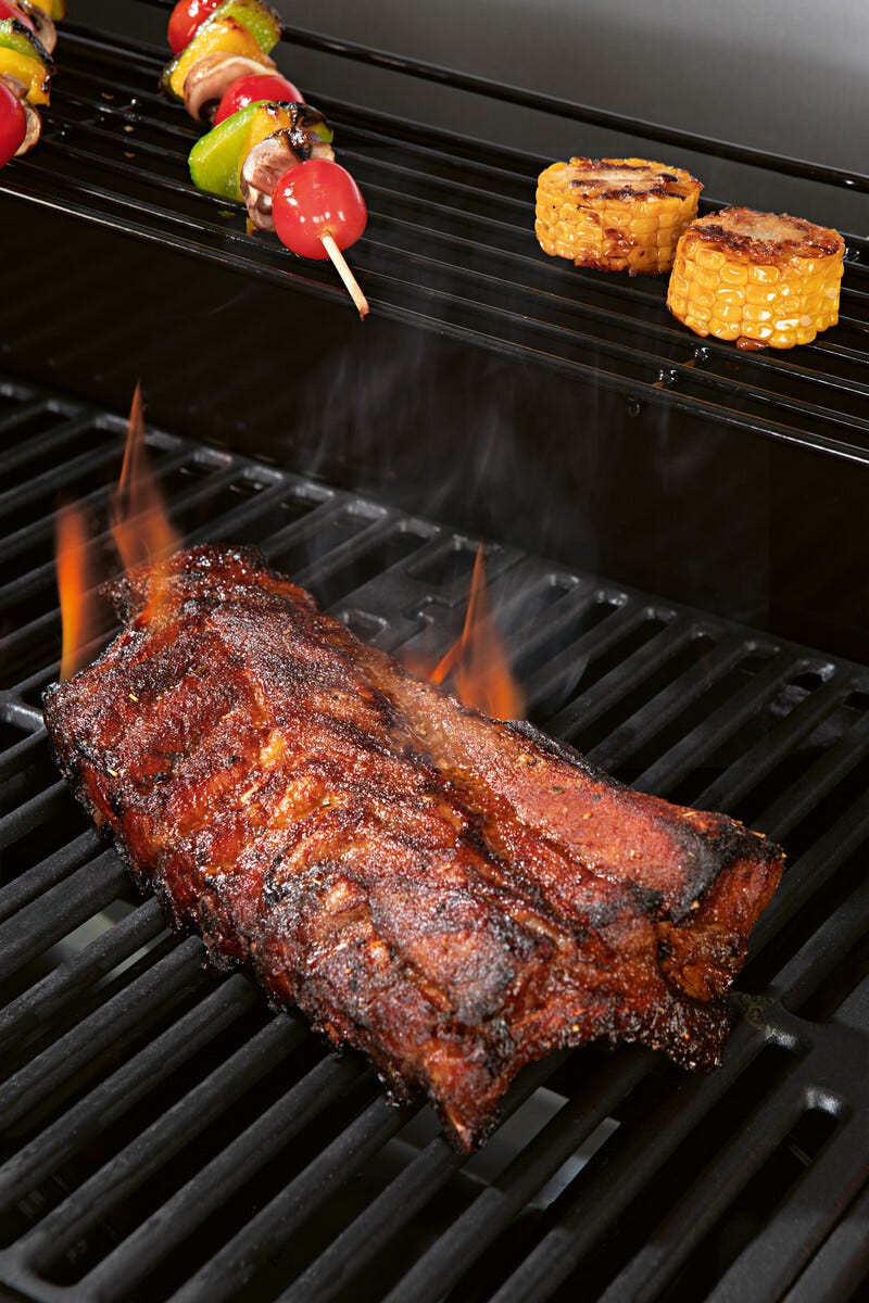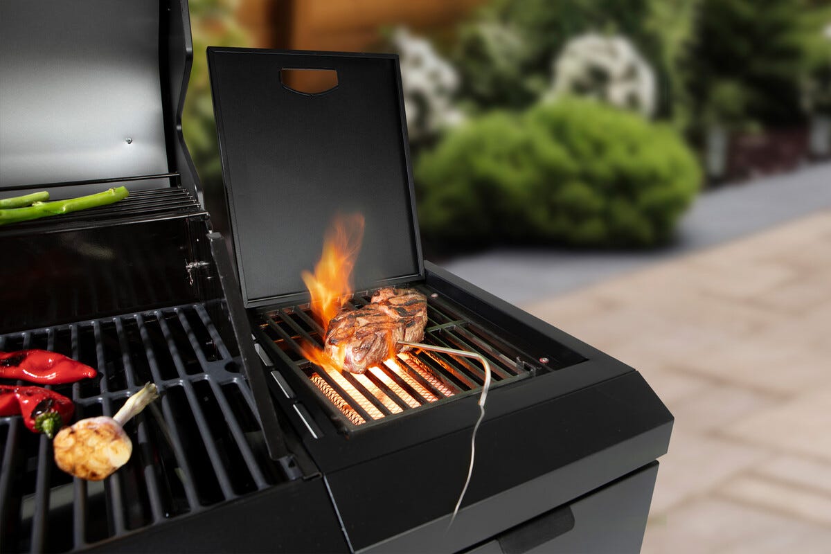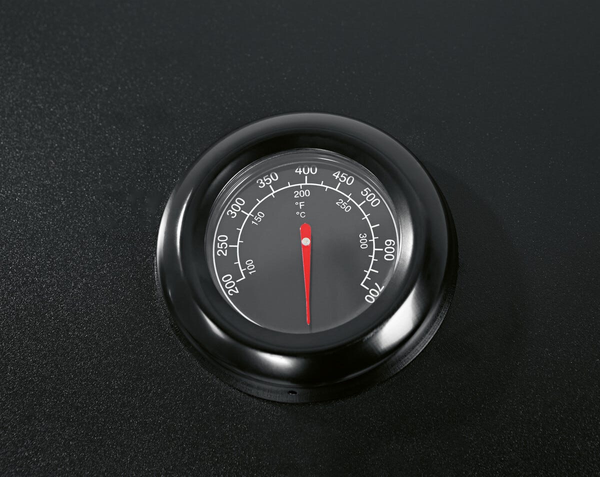 • Stort grillområde (96 x 40 cm) med støpejernsrist og innebygd termometer i grillokket.